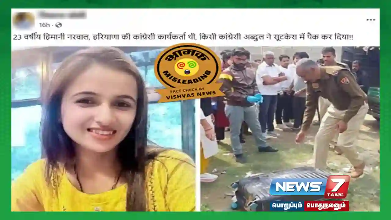 ஹரியானா மாநிலத்தில் ஹிமானி நர்வால் கொலை வழக்கோடு தொடர்புபடுத்தி ஒரு வகுப்புவாத பதிவு சமூக ஊடகங்களில் வைரலாகி வருகிறது. இதில், இரண்டு படங்கள் பதிவேற்றப்பட்டு, ஹிமானி நர்வால் ஒரு முஸ்லிம் காங்கிரஸ் ஊழியரால் கொலை செய்யப்பட்டதாகக் கூறப்படுகிறது. இந்தப் புகைப்படங்களில் ஒன்று ஹிமானியுடையது, மற்றொன்று ஒரு சூட்கேஸின் புகைப்படம்.