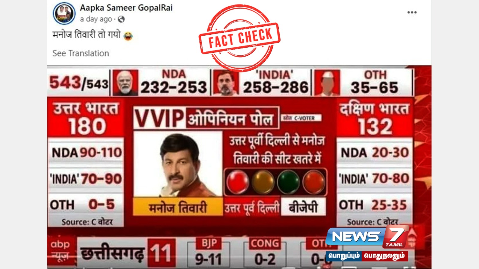 மக்களவைத் தேர்தலில் வடகிழக்கு டெல்லி தொகுதி பாஜக வேட்பாளர் மனோஜ் திவாரி தோல்வியடைவார் என ABP-CVoter கருத்துக்கணிப்பு கூறுவதாக வைரல் ஆகும் ஸ்க்ரீன் ஷாட் போலியானது என்பது அம்பலமாகியுள்ளது.