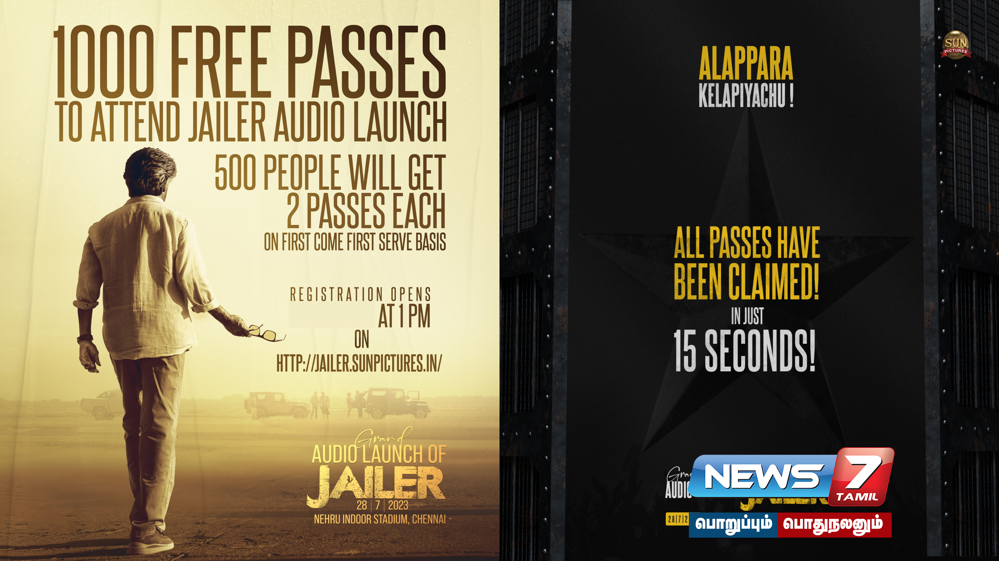 இந்த பிரம்மாண்ட இசை வெளியீட்டு விழா சென்னை நேரு உள்விளையாட்டு அரங்கில் நடக்கவுள்ளதாக படக்குழு அறிவித்தது. ஜெயிலர் படத்தின் இசை வெளியீட்டு விழாவை நேரில் காண 500 பேருக்கு தலா 2 அனுமதிச் சீட்டுகள் இலவசமாக வழங்கப்படுமென படக்குழு அறிவித்திருந்தது. அதற்கான முன்பதிவு இன்று மதியம் தொடங்கும் எனவும் படக்குழு அறிவித்தது.