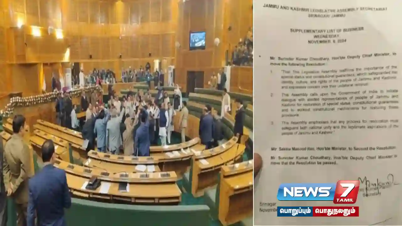ஜம்மு காஷ்மீர் முதலமைச்சராக தேசிய மாநாடு கட்சி துணைத் தலைவர் உமர் அப்துல்லா பதவி ஏற்றார். மத்திய பாஜக அரசால் கடந்த 2019 ஆம் ஆண்டு சிறப்பு அந்தஸ்து [சட்டப்பிரிவு 370] ரத்து செய்யப்பட்டு, இரு யூனியன் பிரதேசங்களாக (ஜம்மு- காஷ்மீர், லடாக்) பிரிக்கப் பட்ட பிறகு நடைபெற்ற முதல் சட்டமன்ற மன்ற தேர்தல் இதுவாகும். இந்நிலையில், ஜம்மு காஷ்மீருக்கு நீக்கப்பட்ட சிறப்பு அந்தஸ்தை மீண்டும் வழங்க வலியுறுத்தி அம்மாநில சட்டசபையில் இன்று தீர்மானம் நிறைவேற்றப்பட்டது. இந்த தீர்மானத்திற்கு பாஜக எம்.எல்.ஏ.க்கள் கடுமையான எதிர்ப்பு தெரிவித்தனர்.
