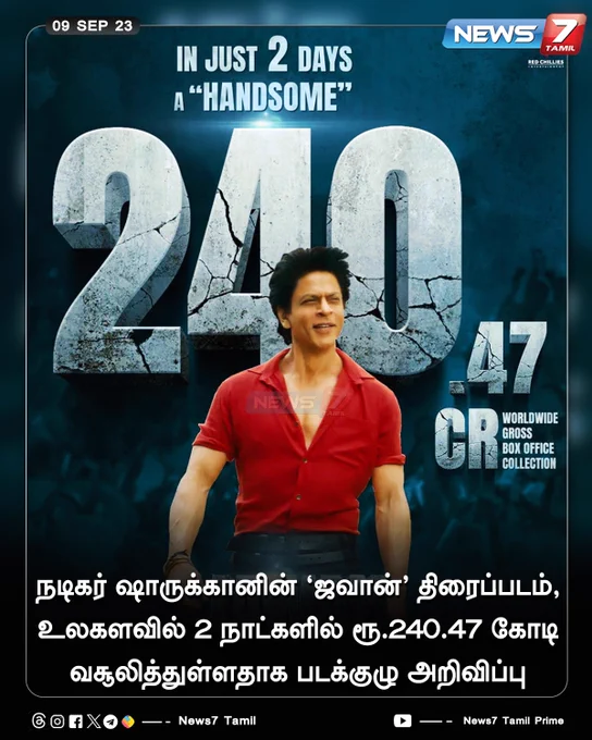 ’ஜவான்’ படம் இரண்டு நாட்களில் ரூ.240.47 கோடி ரூபாய் வசூல் செய்துள்ளதாக படக்குழு அதிகாரப்பூர்வமாக அறிவித்துள்ளது.