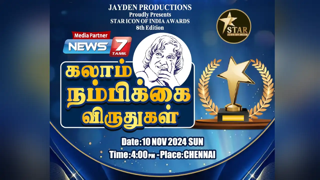 ‘கலாம் நம்பிக்கை விருதுகள்’ ஆண்டுதோறும் வழங்கப்பட்டு வருகிறது. அந்த வகையில், 8ம் ஆண்டு ‘கலாம் நம்பிக்கை விருதுகள்’ இன்று (நவ.10) வழங்கப்படுகிறது. இந்த விருது வழங்கும் நிகழ்ச்சியை ஜேடன் புரோடக்ஷன்ஸ் மற்றும் ஸ்டார் ஐகான் ஆஃப் இந்தியா இணைந்து நடத்தவுள்ளன. இந்நிகழ்ச்சி சென்னை ராஜா அண்ணாமலைபுரத்தில் அமைந்துள்ள முத்தழிப் பேரவையில் இன்று (நவ.10) மாலை 4 மணியளவில் நடைபெறவுள்ளது.