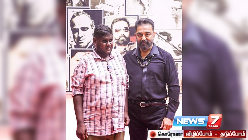 பார்வை மாற்றுத்திறனாளியான திருமூர்த்தியை அழைத்து நடிகர் கமல்ஹாசன் பாராட்டியுள்ளார்.