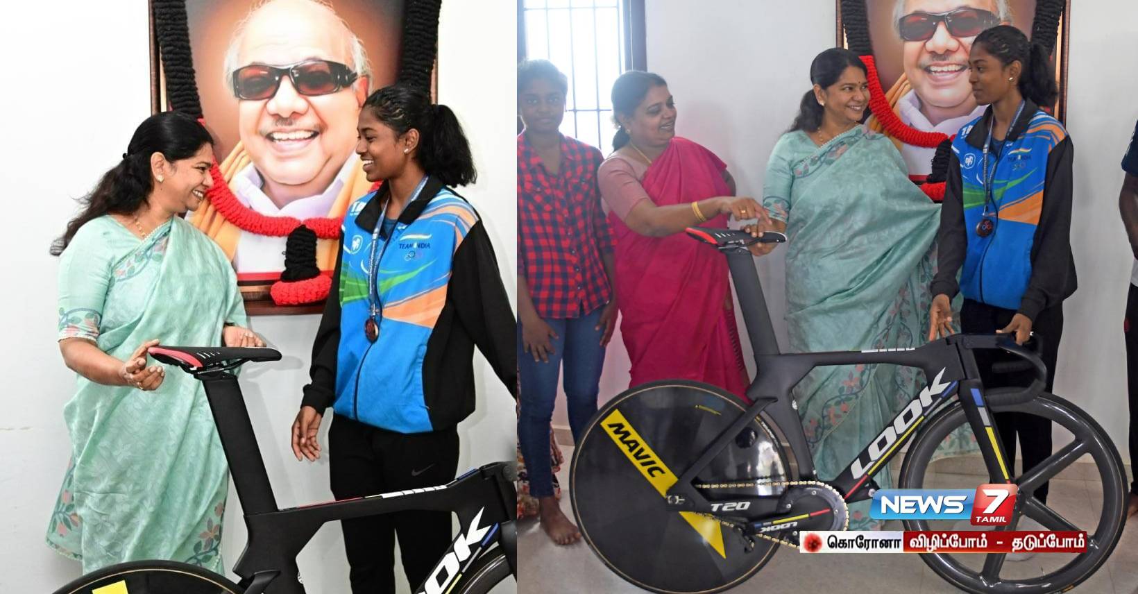 தூத்துக்குடி மாவட்டம், ஒட்டபிடாரம் பகுதியைச் சேர்ந்த சைக்கிள் பந்தய வீராங்கனைக்கு ரூ.14 லட்சம் மதிப்பிலான ஸ்போர்ட்ஸ் சைக்கிளை திமுக கனிமொழி எம்.பி. வழங்கி ஊக்கப்படுத்தினார்.