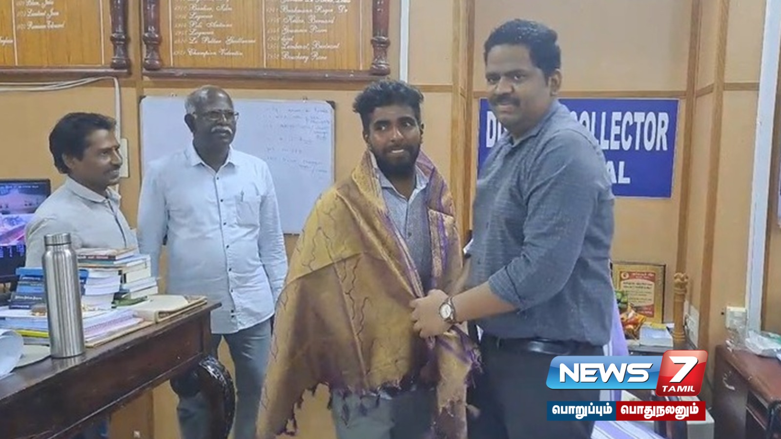 காரைக்கால் கடலில் குளித்த போது ராட்சத அலையில் சிக்கிய பள்ளி மாணவர்களை காப்பாற்றிய இளைஞரை நேரில் அழைத்து மாவட்ட ஆட்சியர் குலோத்துங்கன் பாராட்டினார்.