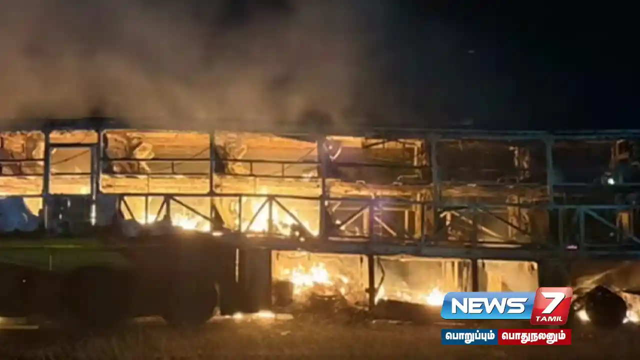 இந்த விபத்தில் பேருந்து, லாரி இரண்டும் தீப்பிடித்து எறிந்துள்ளது. இந்த விபத்தில் பேருந்தில் பயணித்த 17 பேர் உடல் கருகி பரிதாபமாக உயிரிழந்துள்ளனர். மேலும் இந்த விபத்தில் சிக்கிய சிலர், படுகாயங்களுடன் மீட்கப்பட்டு, மருத்துவமனையில் சிகிச்சை பெற்று வருகின்றனர். இந்த விபத்து குறித்து அதிகாரிகள் விசாரணை நடத்தி வருகின்றனர். விபத்தில் 17 பேர் உயிரிழந்த சம்பவம் அப்பகுதியில் சோகத்தை ஏற்படுத்தியுள்ளது.