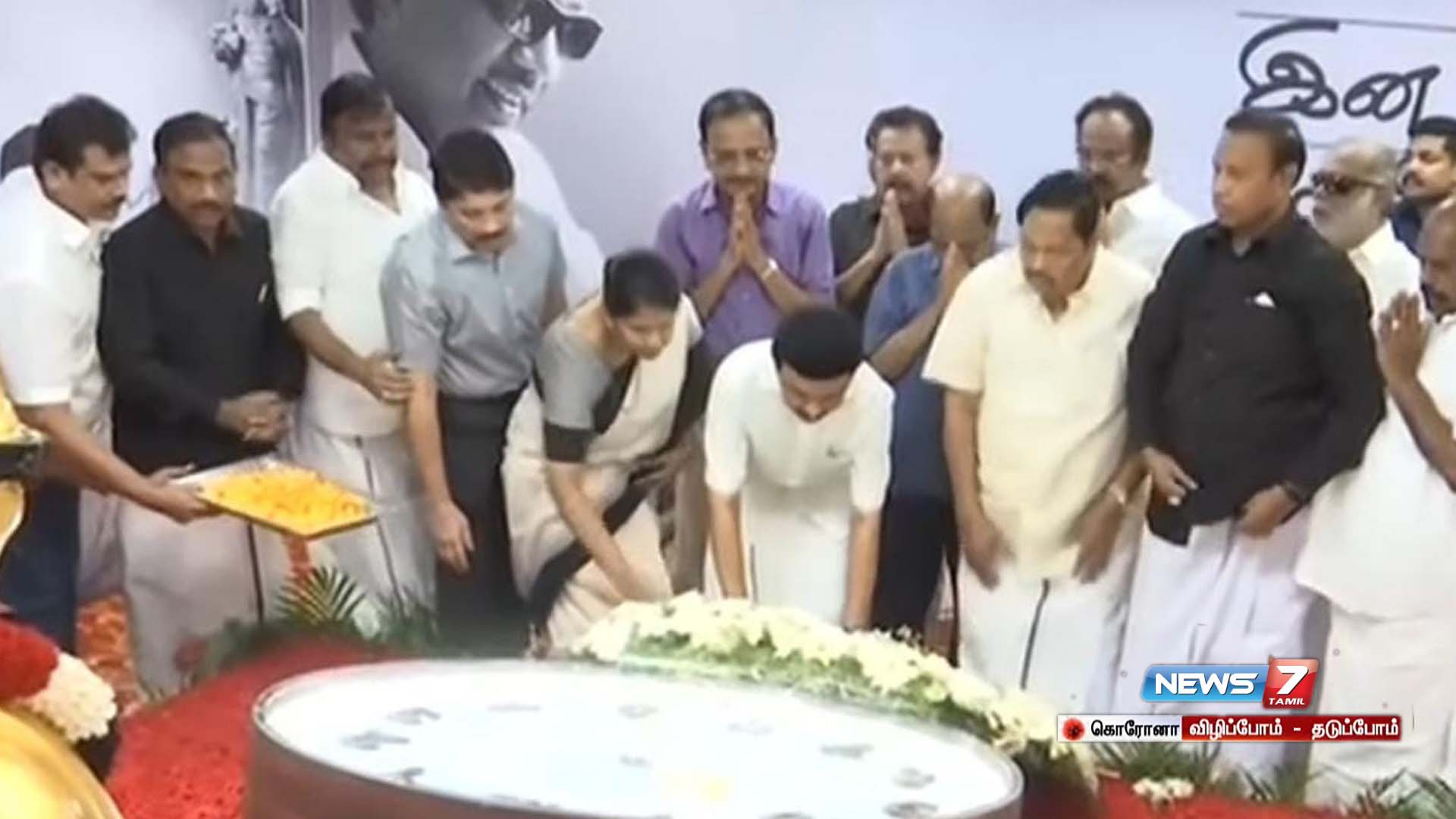 திமுக தலைவர் மு.க.ஸ்டாலின் தலைமையில் அமைச்சர்கள், எம்.பி., எம்.ல்.ஏ.க்கள், திமுக தொண்டர்கள் சென்னையில் அமைதி பேரணியாக சென்று கருணாநிதி நினைவிடத்தில் மலர் தூவி மரியாதை செலுத்தினர்.
