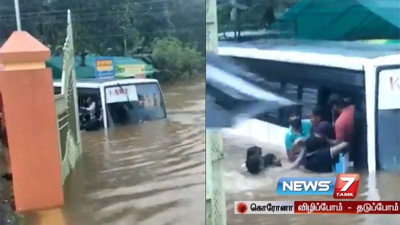 சிவப்பு அலர்ட் விடுக்கப்பட்ட கோட்டயம் மாவட்டத்தின் பூன்ஜர் பகுதியில் பேருந்து ஒன்று வெள்ளத்தில் சிக்கியுள்ளது. அதில் சிக்கிய பயணிகள் வெளியே வர முடியாமல் தவிக்கின்றனர். இதுதொடர்பான வீடியோ தற்போது சமூக வலைதளத்தில் பரவி வருகிறது.