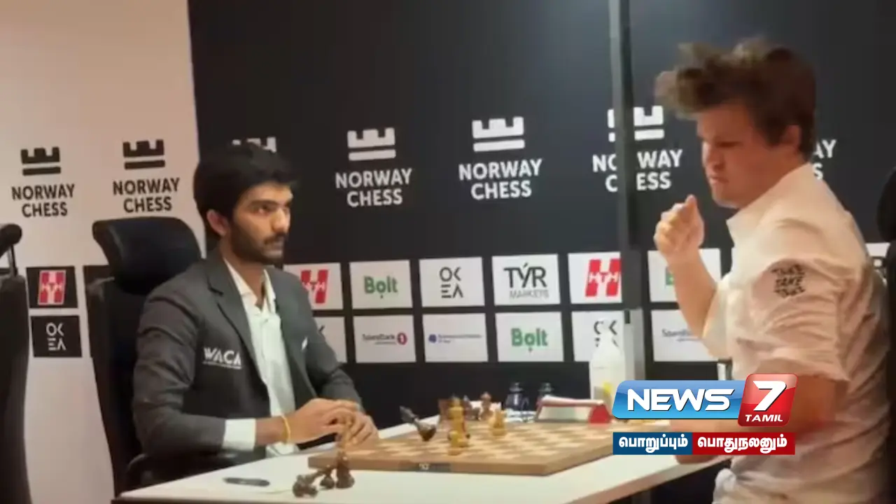 ஸ்டாவஞ்சரில் இன்று நடந்த செஸ் போட்டியில் ஸ்கோர்போர்டை விட உணர்ச்சிகளே அதிகம் பேசின. உலகின் நம்பர் 1 செஸ் வீரரான கார்ல்சன், நடப்பு உலக சாம்பியனான டி. குகேஷிடம் தோல்வியை தழுவிய பிறகு செஸ்போர்டை குத்தும் வீடியோ வைரலாகி வருகிறது.