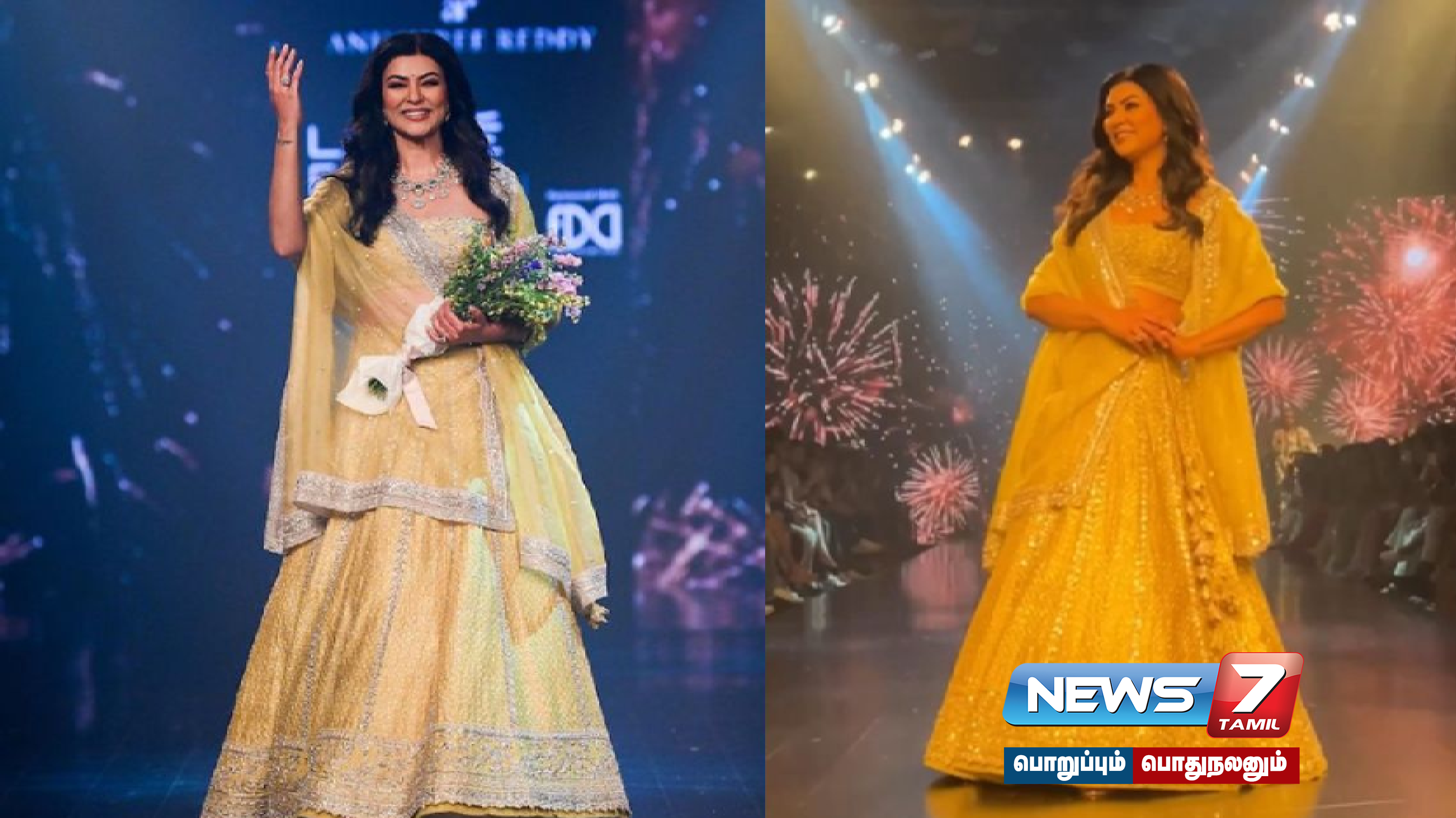 இந்நிலையில், மாரடைப்பு ஏற்பட்ட பிறகு மீண்டும் சுஷ்மிதா சென் ராம்ப் வாக் செய்துள்ள வீடியோ தற்போது சமூக வலைதளங்களில் வைரலாகி வருகிறது. லாக்மே பேஷன் ஷோவில் பங்கேற்ற அவர் பழுப்பு மஞ்சள் நிறத்தில் லெகங்கா அணிந்து ஒய்யராமாக நடந்து வந்தார். அவர் நடந்து வரும் போது அரங்கமே கரயொலியால் அதிர்ந்தது. அவரது கம்பீராமான நடை அனைவரது கவனத்தையும் ஈர்த்தது. இந்த வீடியோ தற்போது சமூக வலைதளத்தில் வைரலாகி வருகிறது.