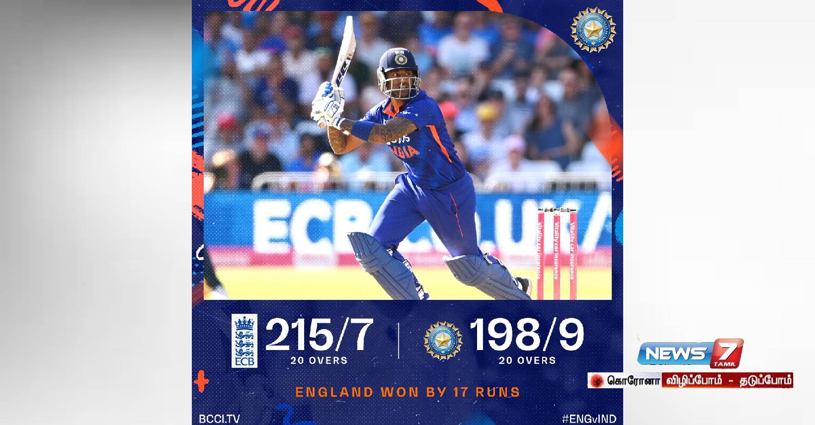 அவர் அரை சதம் பதிவு செய்ததுடன், அவருடன் ஜோடி சேர்ந்த ஸ்ரேயஸ் ஐயரும் நிதானமாக விளையாடினார். எனினும் அடுத்து வந்தவர்களும் ஆட்டமிழக்க இந்திய அணி தோல்விப் பாதைக்குச் சென்றது. 20 ஓவர்களில் இந்தியா 9 விக்கெட் இழப்புக்கு 198 ரன்களை மட்டுமே எடுக்க முடிந்தது. சூர்யகுமார் யாதவ் 117 ரன்கள் எடுத்து ஆட்டமிழந்தார். அவரது சதம் வீணானது.