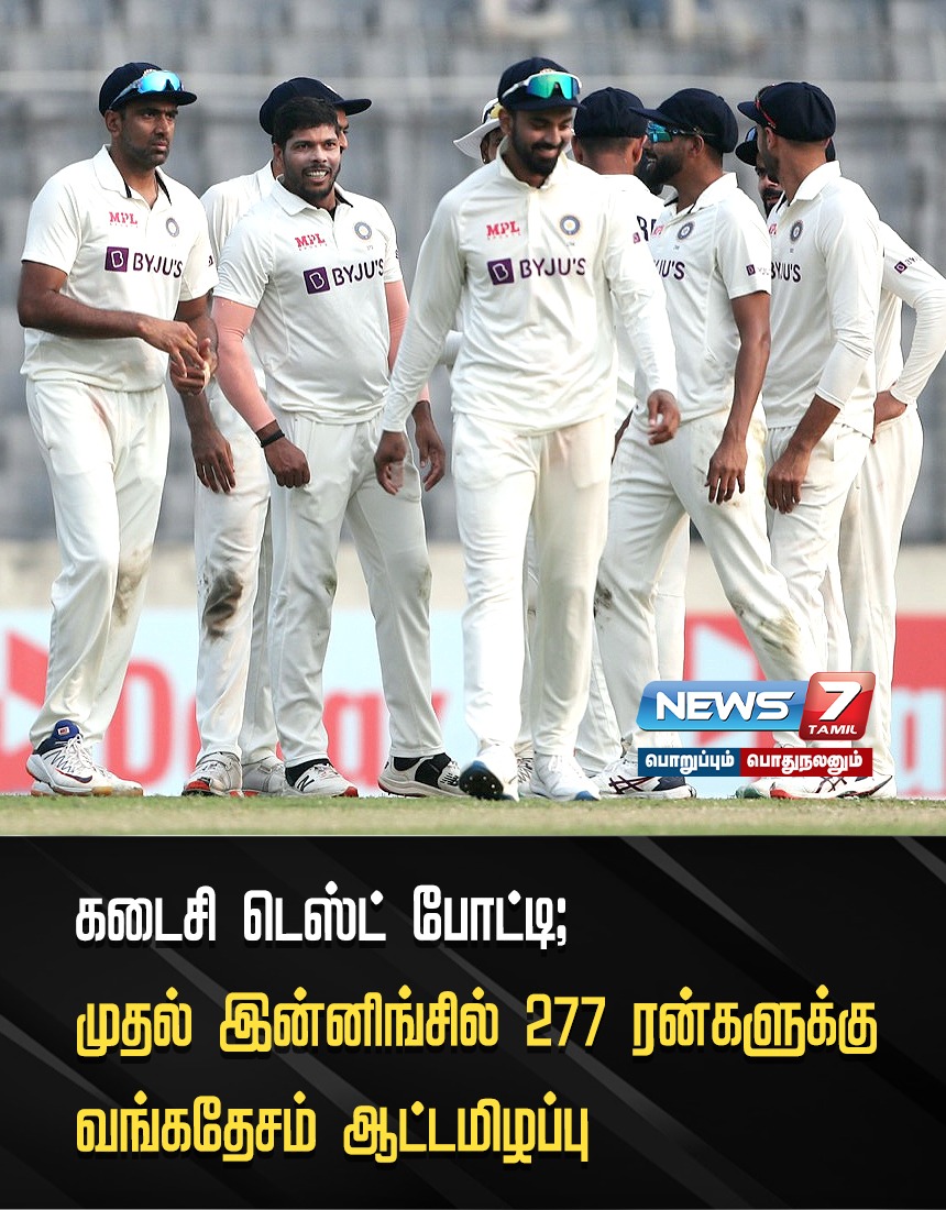 இந்தியா-வங்கதேசத்துக்கான கடைசி டெஸ்ட் போட்டியின் முதல் இன்னிங்சில் வங்கதேச அணி 277 ரன்களுக்கு ஆட்டமிழந்தது.