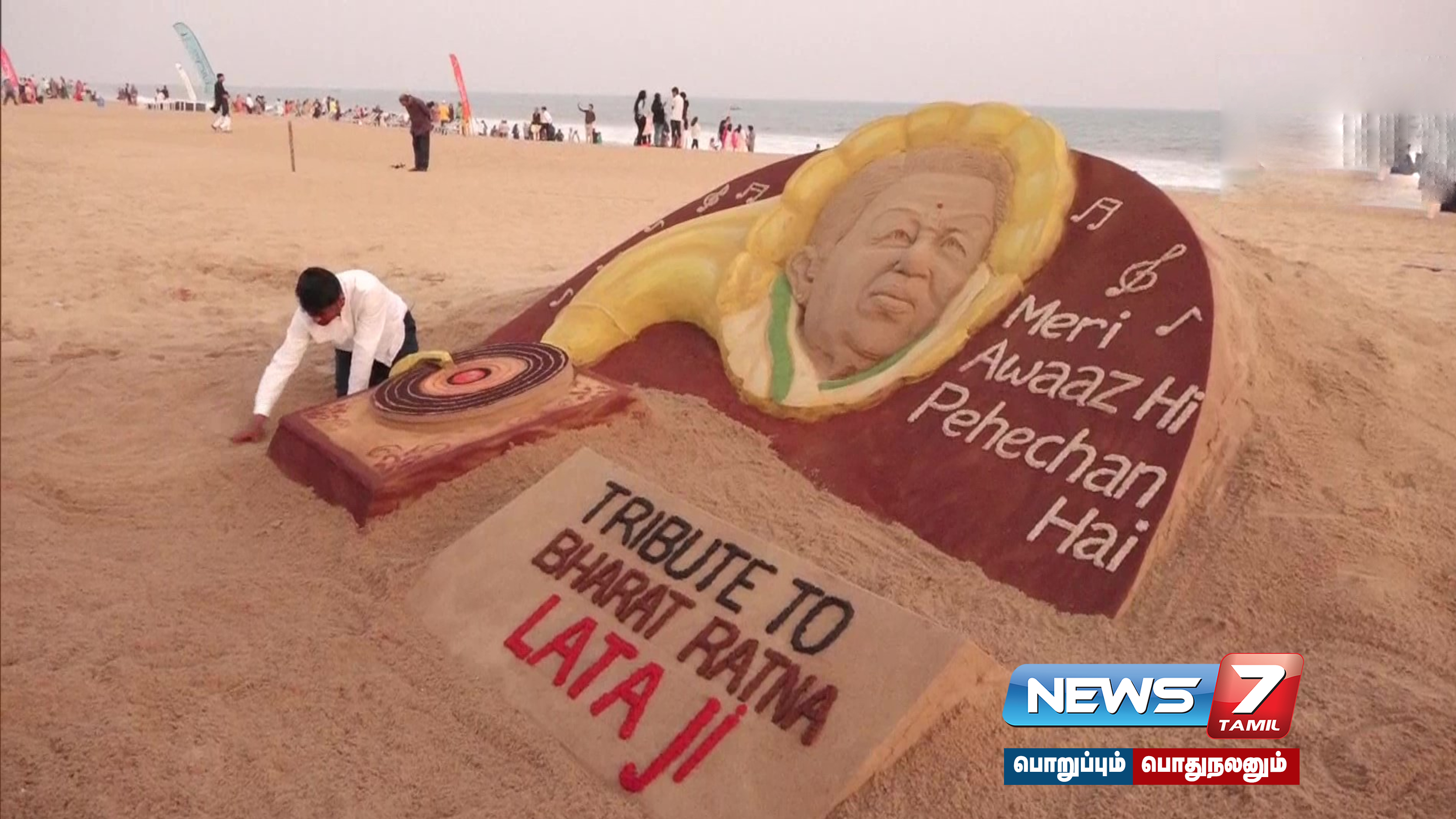 இந்தியாவின் இசைக்குயில் லதா மங்கேஷ்கரின் முதலாம் ஆண்டு நினைவு தினத்தையொட்டி பூரி கடற்கரையில் மணற்சிற்பம் அமைக்கப்பட்டுள்ளது.