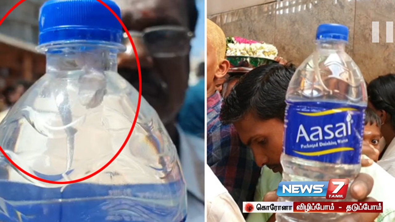 இதைபார்த்து அதிர்ச்சியடைந்த பழனிச்சாமி, தண்ணீர் பாட்டலில் பல்லி கிடப்பது குறித்து கேள்வி எழுப்பினார். இதனால் சுதாகரித்து கொண்ட தண்ணீர் பாட்டில் விற்பனை செய்த இளைஞர், அந்த பாட்டிலை வெடுக்கென்று பிடுங்கி அங்கிருந்து ஓட்டம் பிடித்தார். இதை பார்த்த சக பக்தர்கள் கூச்சலிட்டதால் சிறிது நேரம் பரபரப்பு ஏற்பட்டது.
