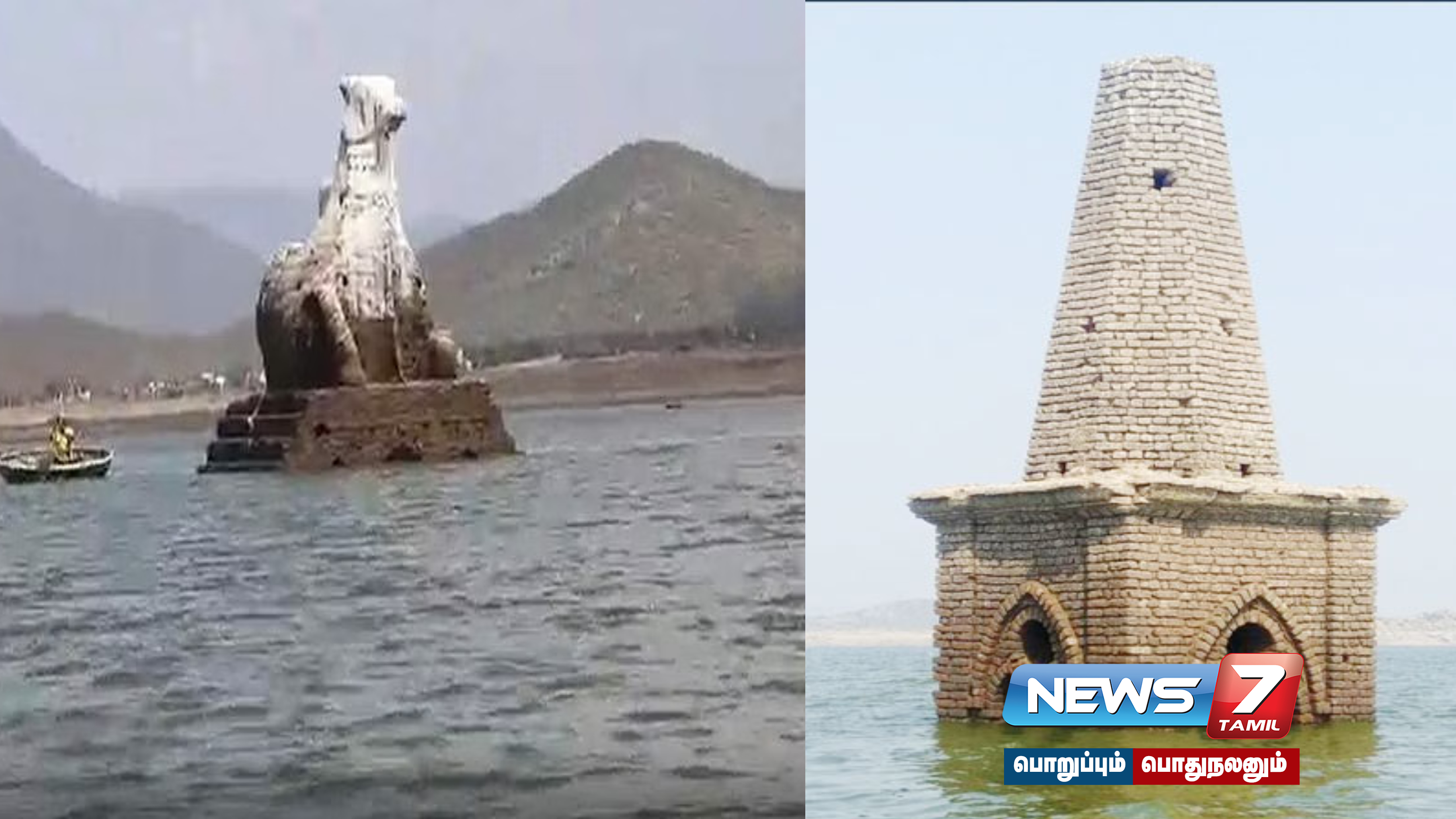 மேட்டூர் அணையின் நீர்மட்டம் குறைந்து வருவதால் நீர்ப்பிடிப்பு பகுதியான பண்ணவாடி பகுதியில் உள்ள பழங்கால நந்தி சிலை வெளியே தெரிகிறது.