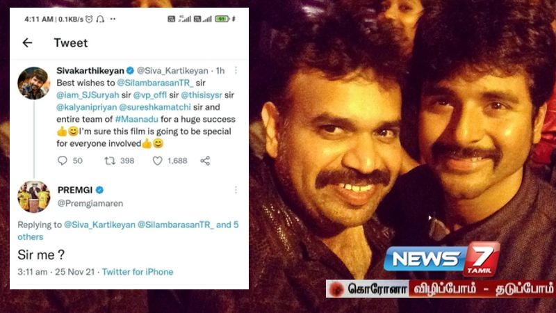 பல்வேறு தரப்பினர் ட்விட்டரில் சிம்பு மற்றும் மாநாடு படக்குழுவினருக்கு வாழ்த்து தெரிவித்து வந்த நிலையில், நடிகர் சிவகார்த்திகேயன் ட்வீட் ஒன்று செய்திருந்தார் அதில், நடிகர் சிம்பு, எஸ்.ஜே.சூர்யா மற்றும் கல்யாணி, யுவன்சங்கர் ராஜா, வெங்கட் பிரபு, சுரேஷ் காமாட்சி உள்ளிட்ட பெயர்களை குறிப்பிட்டு வாழ்த்துகளை தெரிவித்திருந்தார். இதில் நடிகர் பிரேம் ஜி பெயர் மிஸ்ஸிங்.