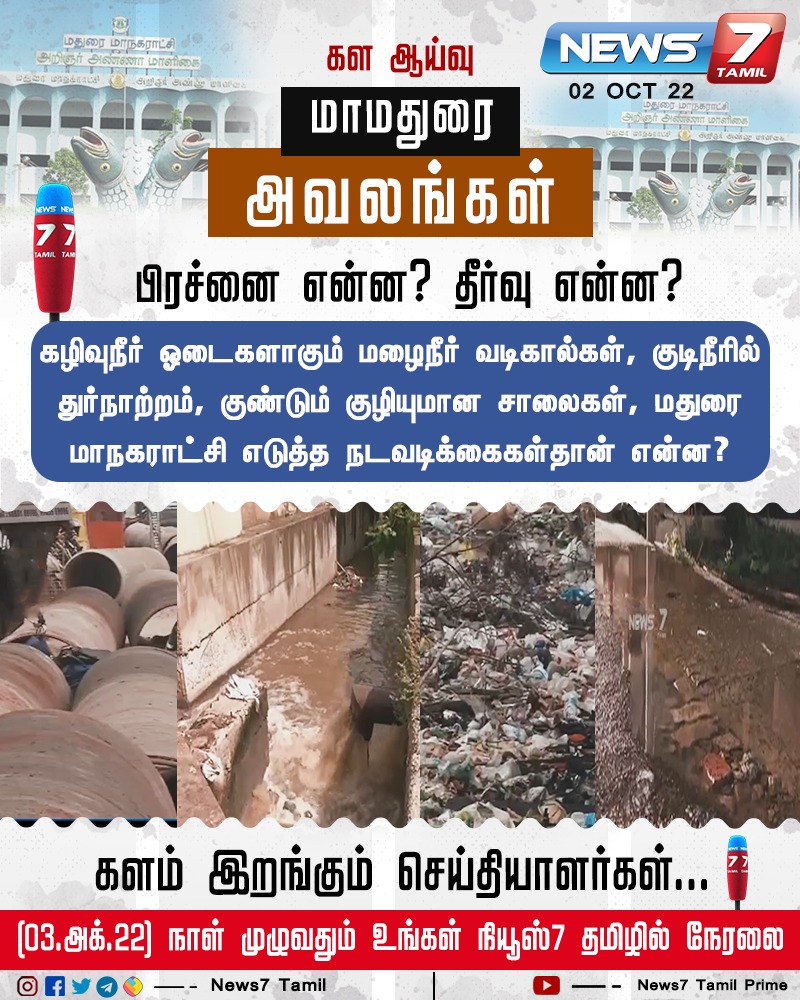 இந்நிலையில், நாளை மாமதுரையில் நியூஸ் 7 தமிழ் செய்தியாளர்கள் களம் இறங்குகின்றனர். ‘மாமதுரை அவலங்கள், பிரச்னை என்ன? தீர்வு என்ன?’ என்ற தலைப்பில் நாளை நாள் முழுவதும் கள ஆய்வு நடைபெறுகிறது. கழிவுநீர் ஓடைகளாகும் மழைநீர் வடிகால்கள், குடிநீரில் துர்நாற்றம், குண்டும் குழியுமான சாலைகள் இதனை பற்றியும் இதற்கு மதுரை மாநகராட்சி எடுத்த நடவடிக்கைகள் என்ன என்பது பற்றியும் விரிவாக நேரலையில் ஒளிப்பரப்பப்படுகிறது.