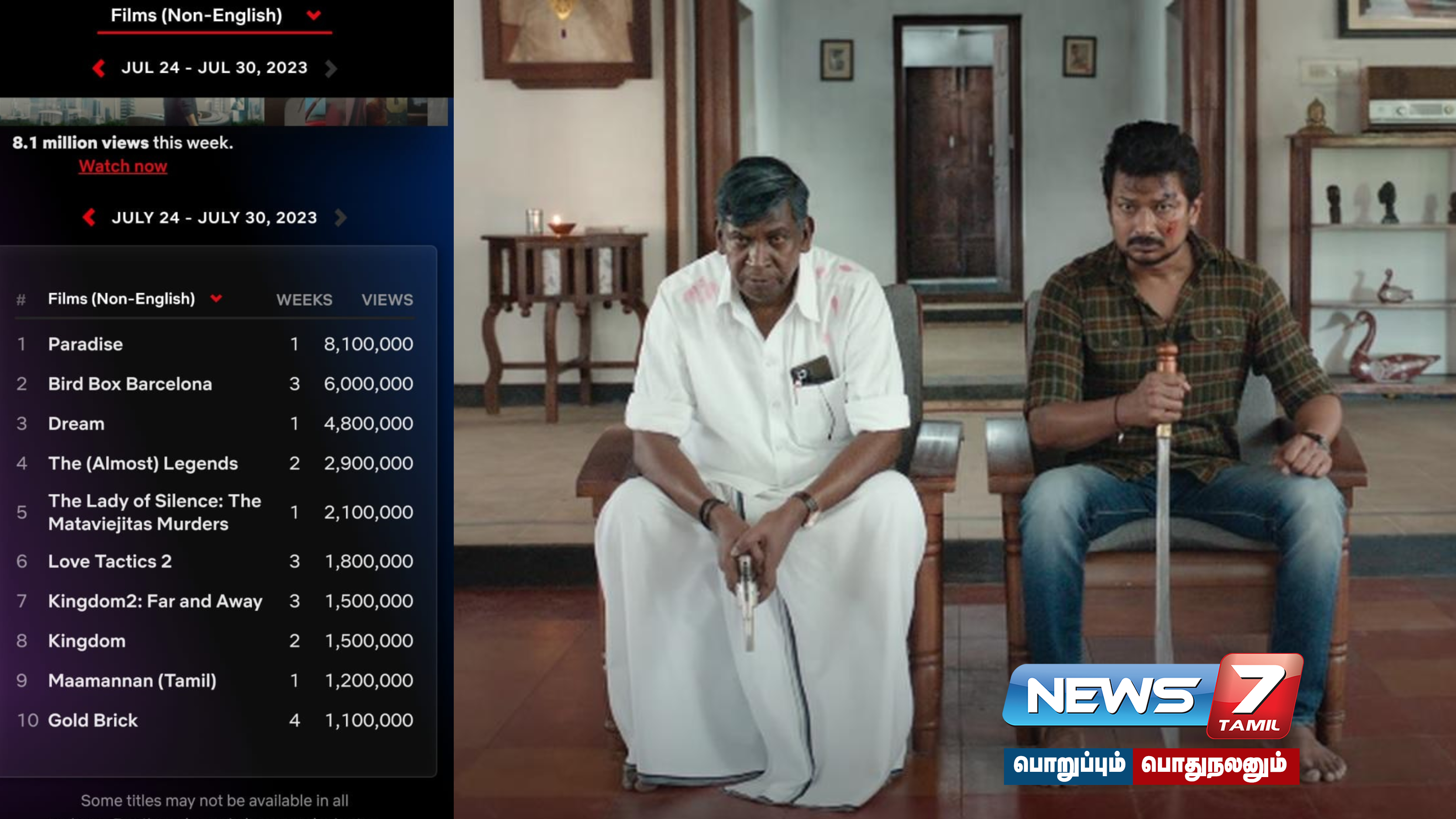 இந்நிலையில், மாமன்னன் நெட்பிளிக்ஸில் இதுவரை 12 லட்சம் பார்வைகளைக் கடந்து அசத்தியதுடன் இந்திய அளவில் முதலிடத்திலும் உலகளவில் 9-வது இடத்தையும் பெற்று சாதனை படைத்து வருகிறது.