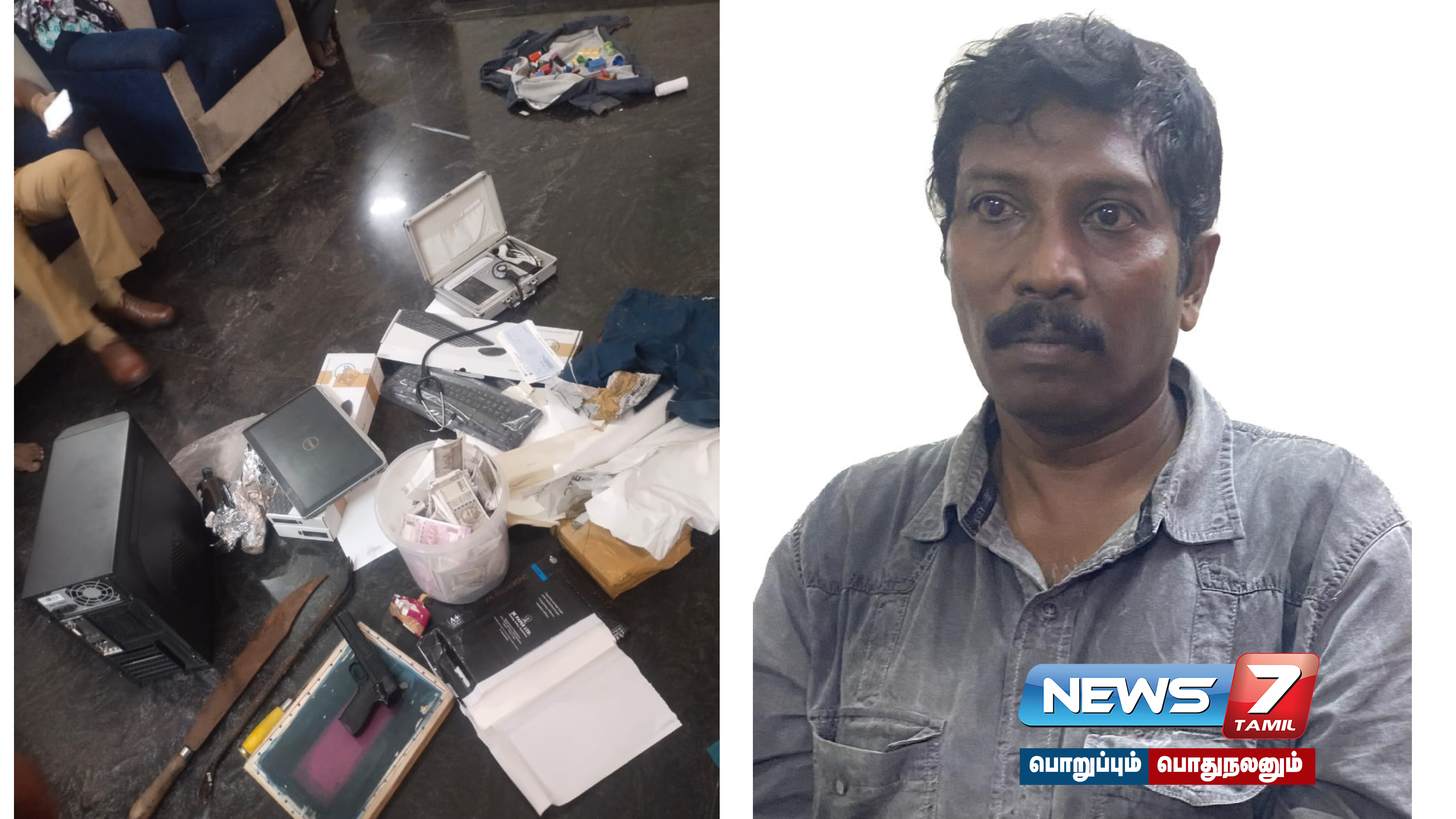 அதில் தங்க முலாம் பூசப்பட்ட போலி தங்க கட்டிகள், அச்சடிக்கப்பட்ட 500 மற்றும் 2000 ரூபாய் நோட்டுகள், ரப்பர் ஸ்டாம்புகள், ஏர்கன் துப்பாக்கி, இரண்டு வாள்கள் ஆகியவை இருந்ததை போலீசார் கண்டறிந்தனர். இதனைத் தொடர்ந்து, அந்த பொருட்களைக் கைப்பற்றிய போலீசார், தங்கராஜ் அளித்த புகாரின் பேரில் வழக்கு பதிவு செய்து விசாரணை மேற்கொண்டு வருகின்றனர்