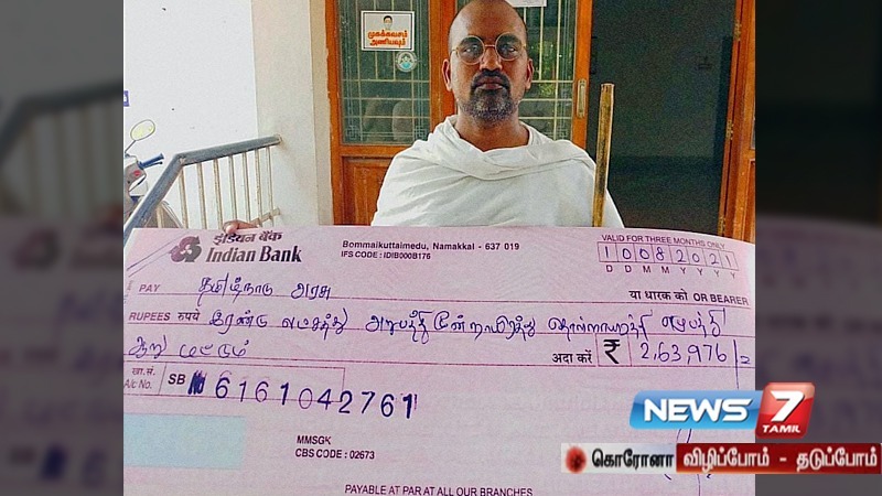 இதனைத் தொடர்ந்து நாமக்கல் அருகே மேற்கு பாலப்பட்டியைச் சேர்ந்த ரமேஷ் தியாகராஜன் என்பவர் ரூ.2,63,976க்கான காசோலை அடங்கிய அட்டையை தயார் செய்து நாமக்கல் கோட்டாட்சியர் அலுவலகத்திற்கு வந்திருந்தார். கோட்டாட்சியர் மு.கோட்டை குமார், அந்த இளைஞர் வழங்கிய காசோலை அட்டையை வாங்க மறுத்துவிட்டார்.
