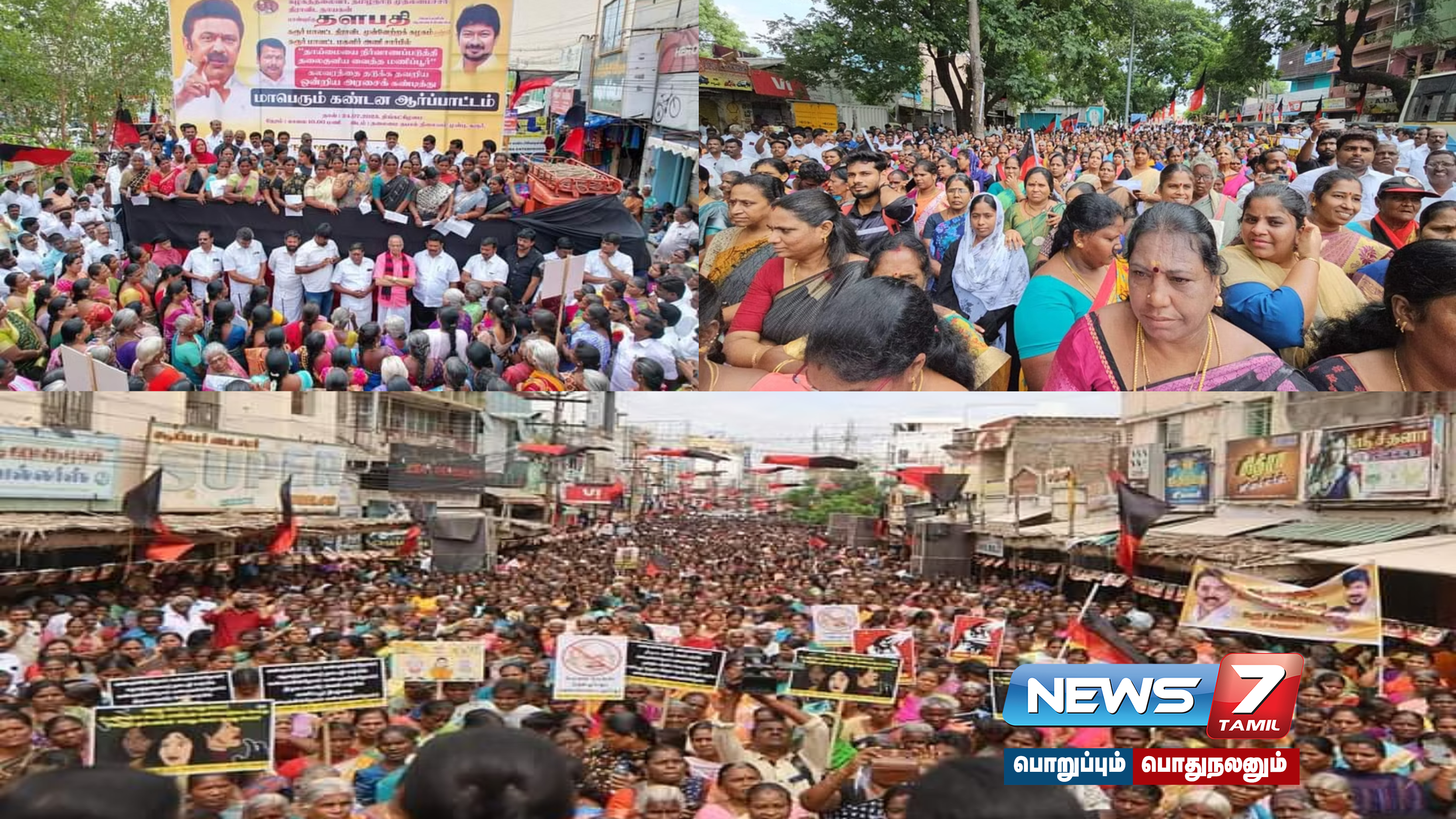 திமுக துணைப் பொதுச் செயலாளரும் மகளிர் அணித் தலைவருமான கனிமொழி எம்.பி. தலைமையில் நேற்று சென்னையில் வள்ளுவர் கோட்டத்தில் ஆர்ப்பாட்டம் நடைபெற்ற நிலையில், இன்று தமிழ்நாடு முழுவதும் அனைத்து மாவட்டத் தலைநகரங்களிலும் நடைபெற்றது.