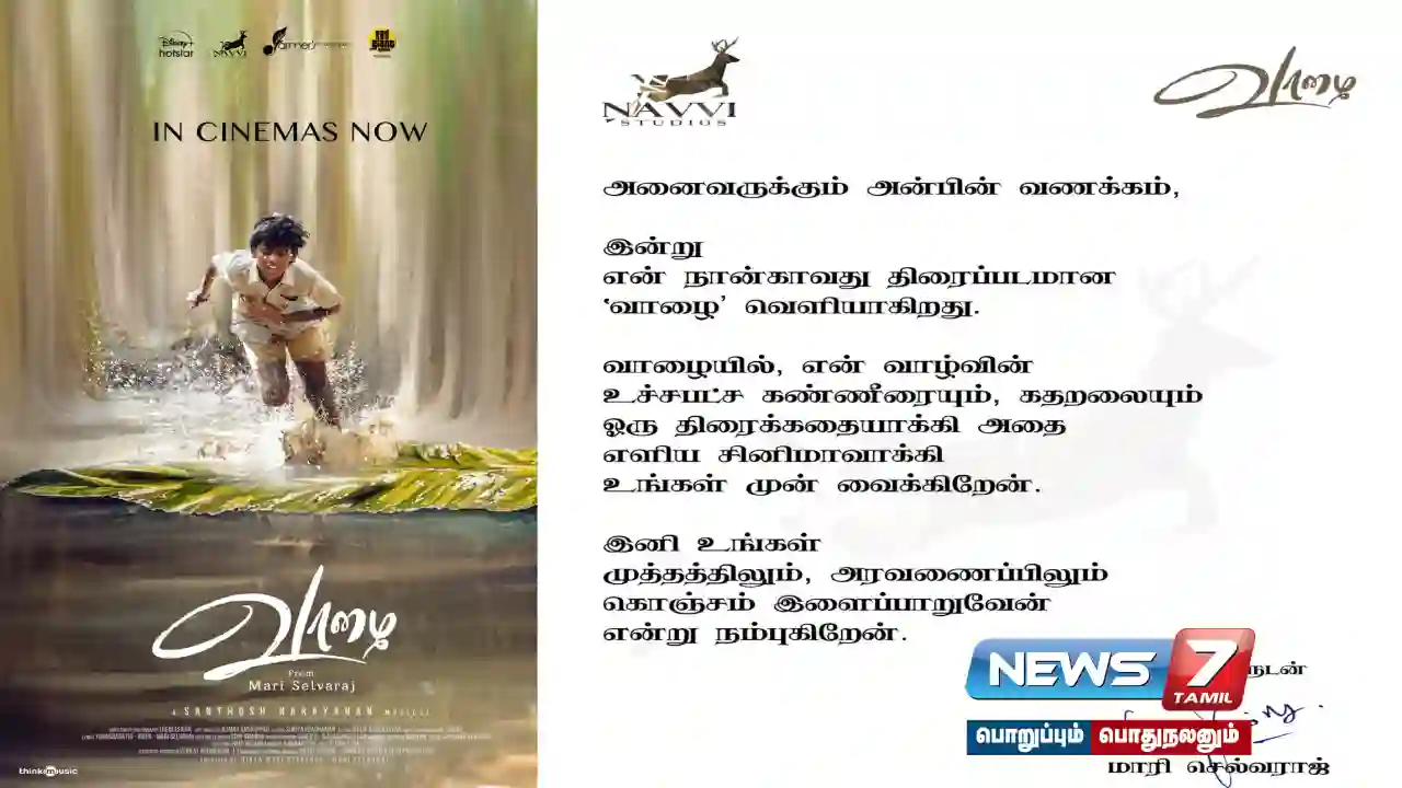 அனைவருக்கும் அன்பின் வணக்கம், இன்று என் நான்காவது திரைப்படமான ‘வாழை’ வெளியாகிறது. வாழையில், என் வாழ்வின் உச்சபட்ச கண்ணீரையும், கதறலையும் ஒரு திரைக்கதையாக்கி அதை எளிய சினிமாவாக்கி உங்கள் முன் வைக்கிறேன். இனி உங்கள் முத்தத்திலும், அரவணைப்பிலும் கொஞ்சம் இளைப்பாறுவேன் என்று நம்புகிறேன். பிரியங்களுடன் மாரி செல்வராஜ் எனப் பதிவிட்டுள்ளார்.