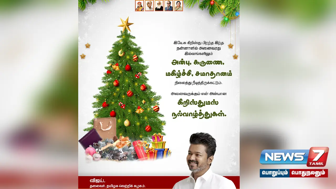 உலகம் முழுவதும் இன்று கிறிஸ்துமஸ் கொண்டாடப்பட்டு வருகிறது. மக்கள் அனைவரும் இயேசு கிறிஸ்துவை வரவேற்கும் விதமாக தேவாலயங்களில் பிரார்த்தனைகளில் ஈடுபட்டு, பண்டிகையை கொண்டாடி வருகின்றனர். கிறிஸ்துமஸ் பண்டிகையை ஒட்டி அரசியல் கட்சி தலைவர்கள் பலரும் வாழ்த்துகளை தெரிவித்து வருகின்றனர். அந்த வகையில் தற்போது தவெக தலைவர் விஜய் அனைவருக்கும் கிறிஸ்துமஸ் வாழ்த்துக்களை தெரிவித்துள்ளார்.