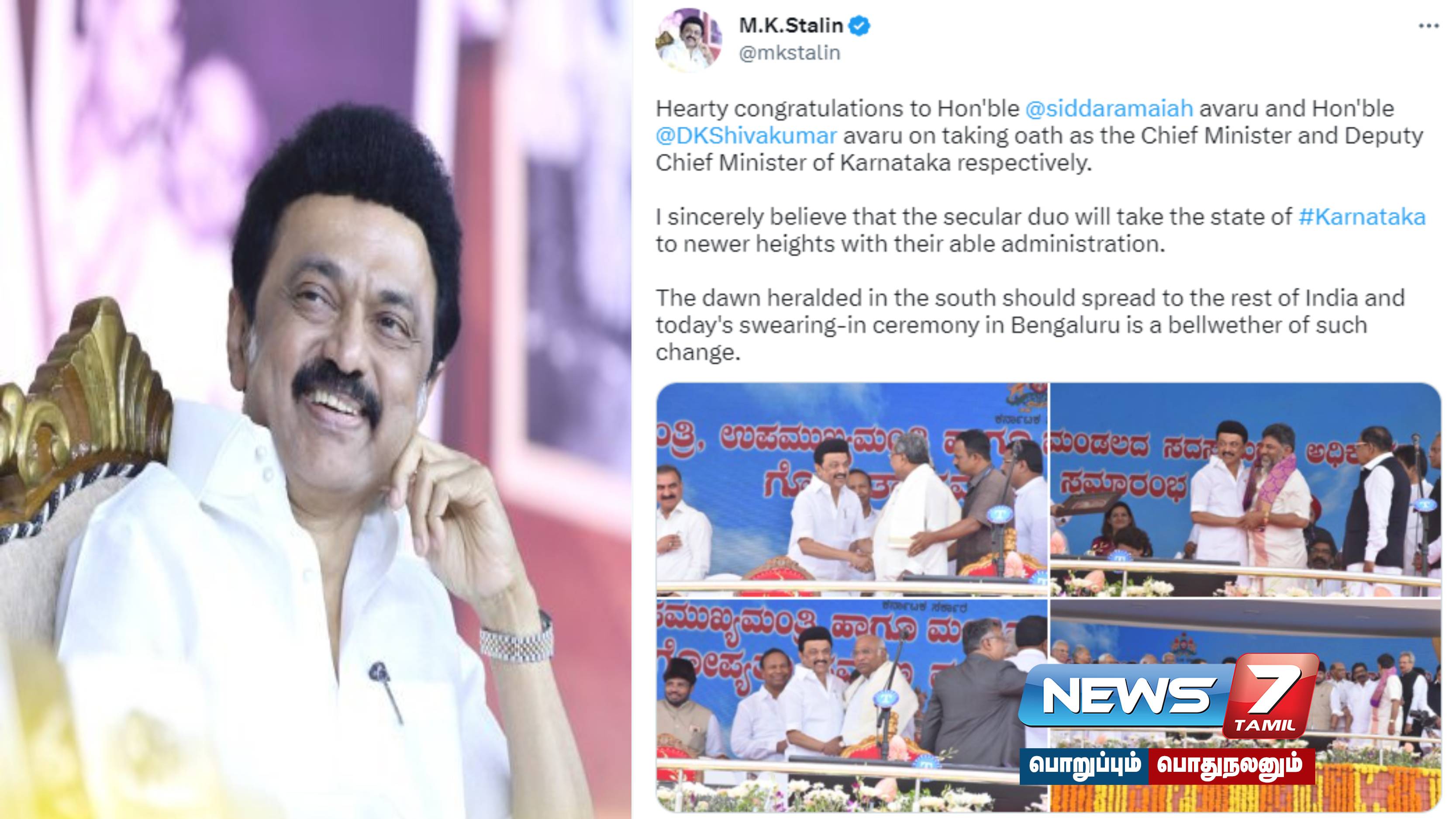 கர்நாடக முதலமைச்சர் மற்றும் துணை முதலமைச்சராக பதவியேற்றுள்ள சித்தராமையா மற்றும் டி.கே.சிவக்குமாருக்கு வாழ்த்து தெரிவித்து தமிழ்நாடு முதலமைச்சர் மு.க.ஸ்டாலின் தனது ட்விட்டர் பக்கத்தில் தெரிவித்துள்ளதாவது..
