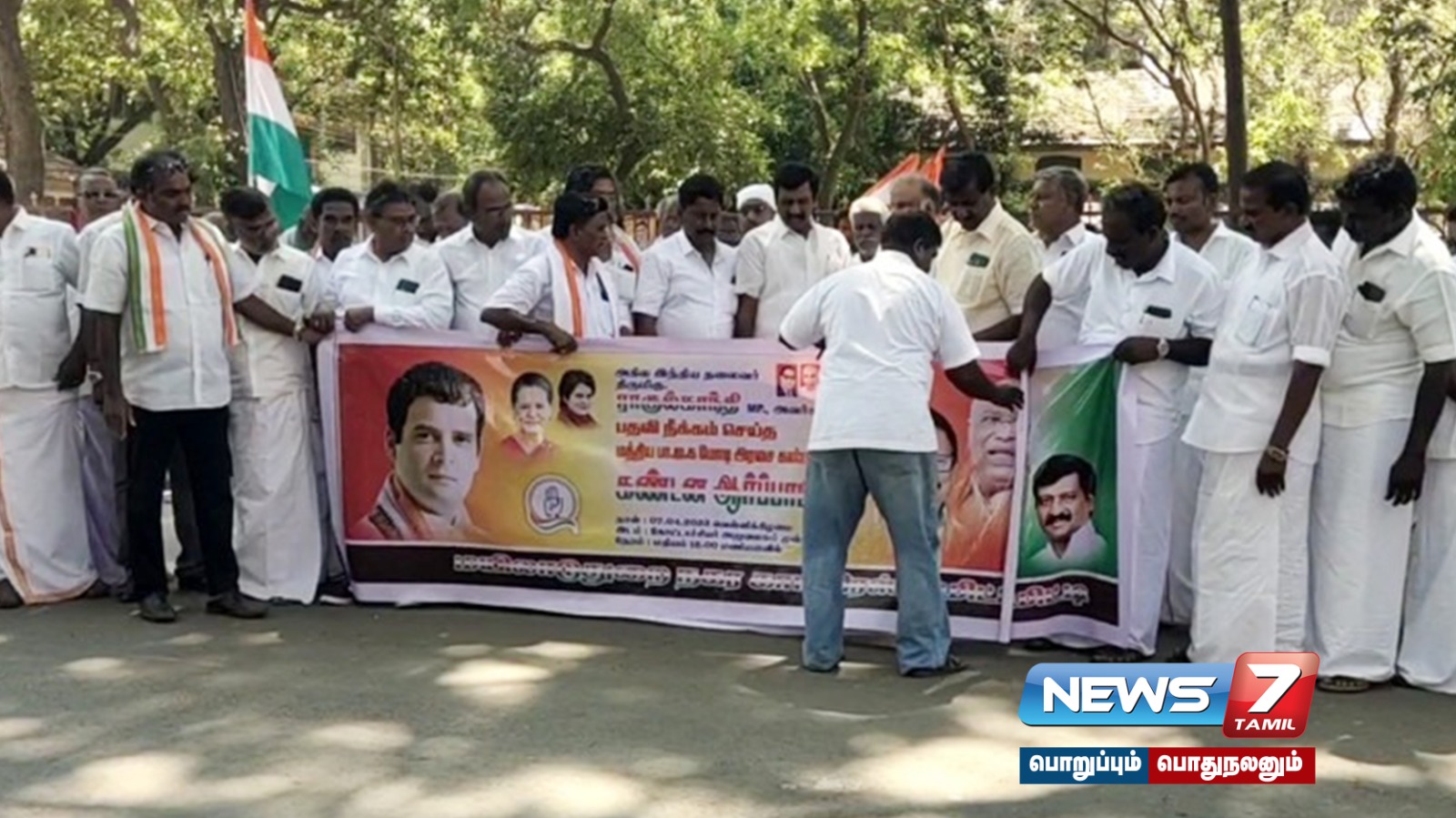 காங்கிரஸ் முன்னாள் தலைவர் ராகுல்காந்தியின் நாடாளுமன்ற உறுப்பினர் பதவி பறிக்கப்பட்டதை கண்டித்து மயிலாடுதுறையில் சட்டமன்ற உறுப்பினர் ராஜ்குமார் தலைமையிலான நடைபெற்ற ஆர்ப்பாட்டத்தில் இரண்டு விதமான பேனர்களை வைத்து இரண்டு போராட்டங்கள் நடைபெற்றதாக