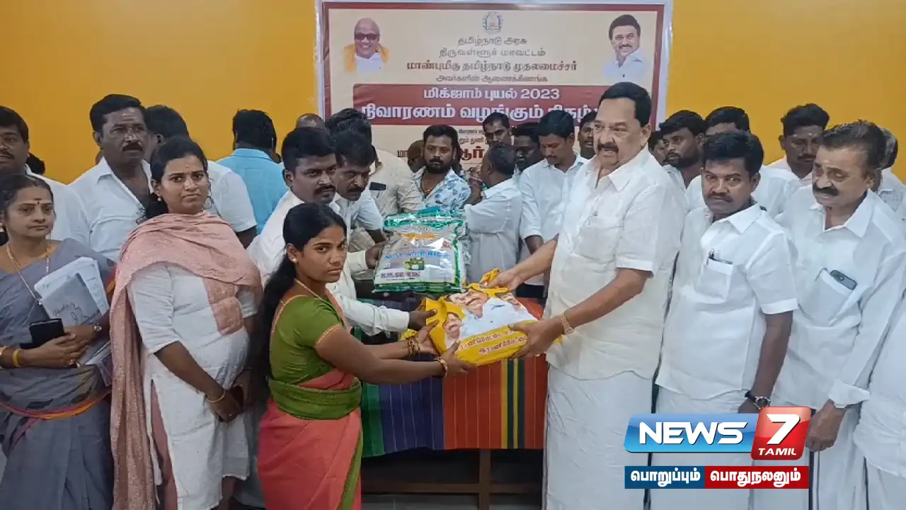 மிக்ஜாம் புயலால் பாதிக்கப்பட்ட பொன்னேரி சுற்றுவட்டார பகுதிகளை சேர்ந்த குடும்பங்களுக்கு, கைத்தறி மற்றும் துணி நூல் துறை அமைச்சர் காந்தி நிவாரண பொருட்களை வழங்கினார்.