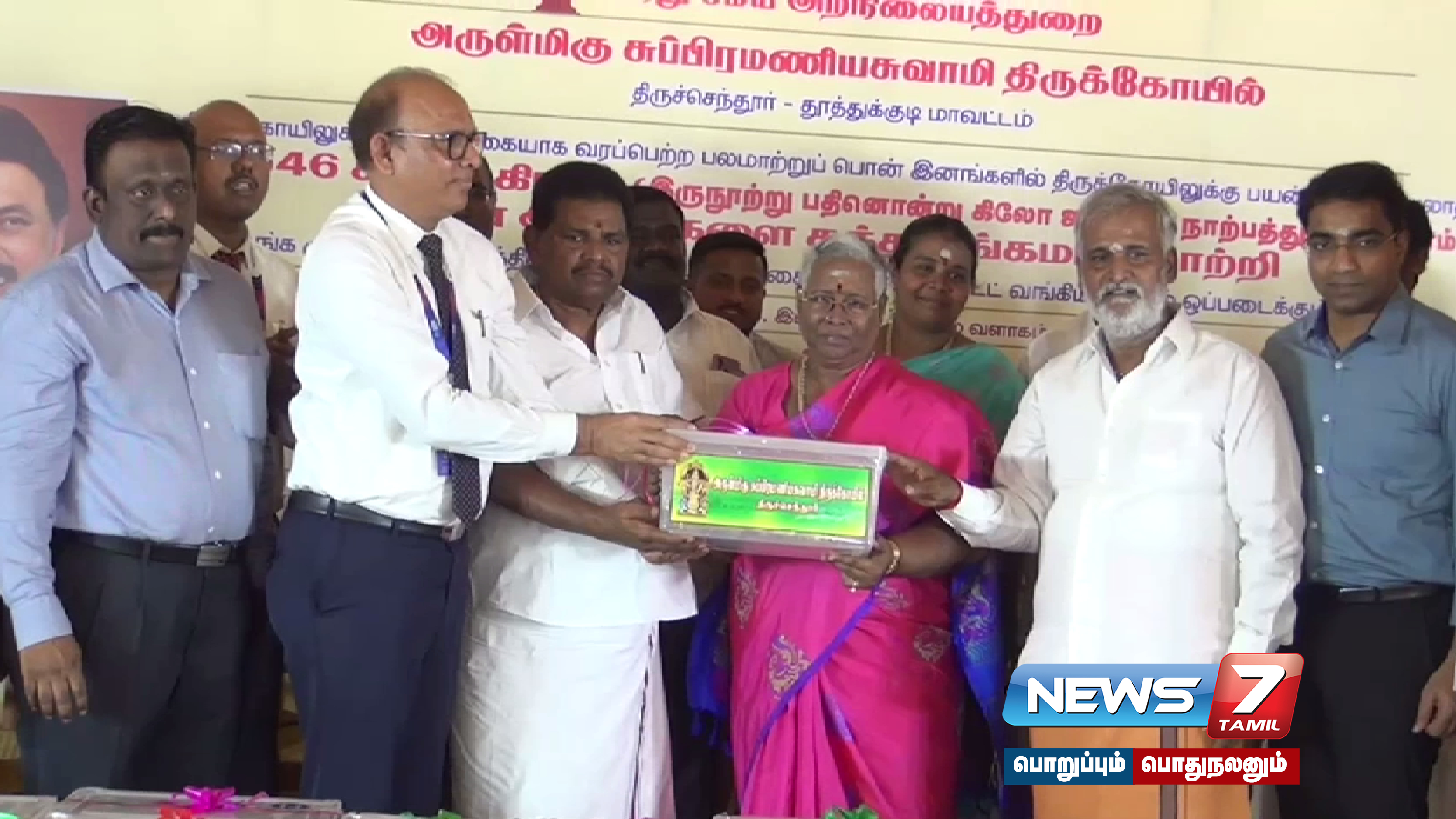 இதன் ஒரு பகுதியாக, திருச்செந்தூர் அருள்மிகு சுப்ரமணிய சுவாமி கோயிலில் பலமாற்று தங்கத்தை வங்கியில் ஒப்படைக்கும் நிகழ்ச்சி நடைபெற்றது. இந்த நிகழ்ச்சியில் அமைச்சர்கள் சேகர்பாபு, அனிதா ராதாகிருஷ்ணன் மற்றும் இந்து சமய அறநிலையத்துறை ஆணையர் முரளிதரன், அறநிலையத்துறை சிறப்பு அலுவலர் குமரகுருபரன், பாரத ஸ்டேட் வங்கி அதிகாரிகள் உட்பட பலர் கலந்து கொண்டனர்.