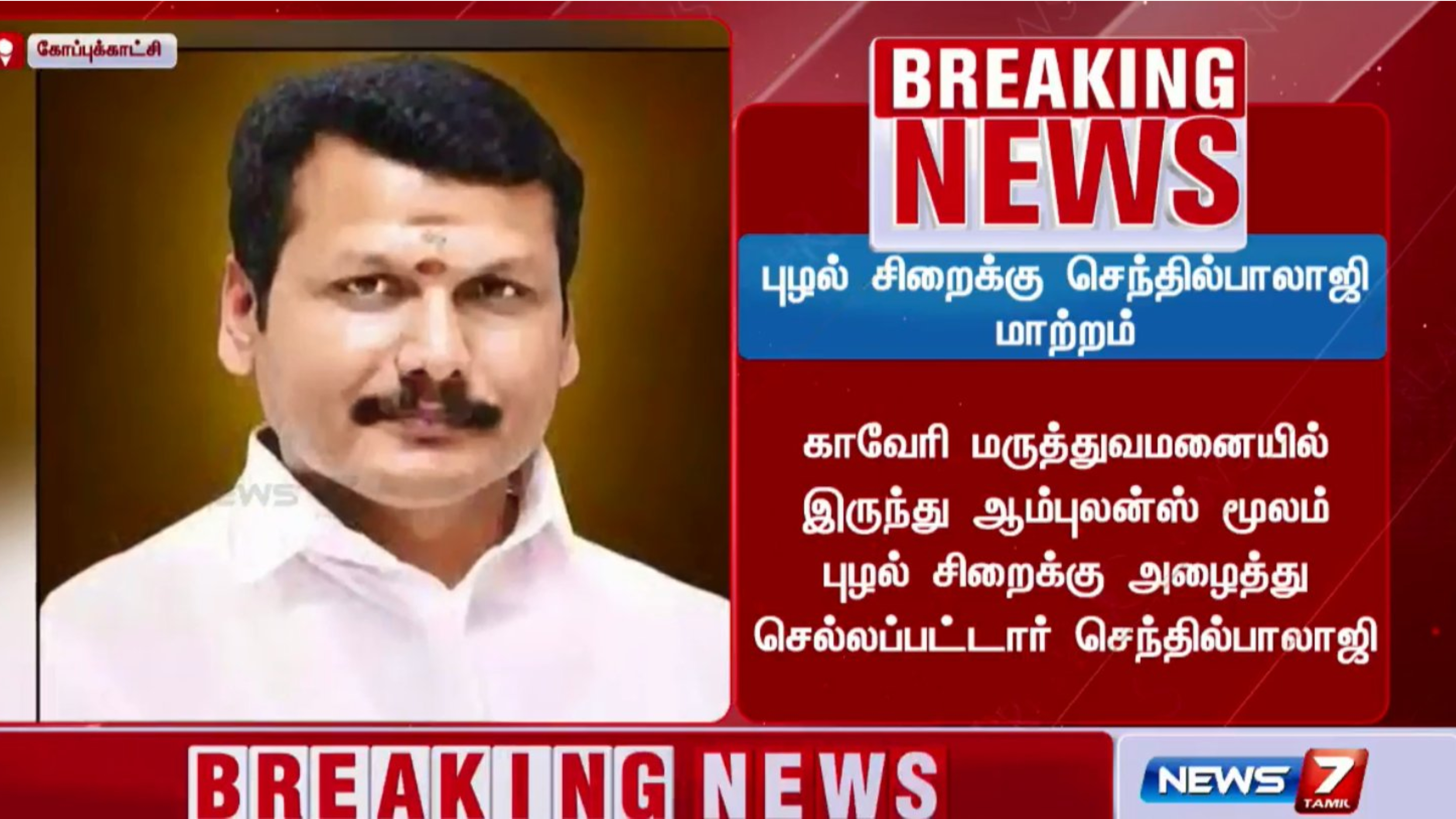 இந்த நிலையில், அமைச்சர் செந்தில் பாலாஜி சென்னை காவேரி மருத்துவமனையிலிருந்து ஆம்புலன்ஸ் மூலம் புழல் சிறைக்கு மாற்றம் செய்யப்பட்டார்.
