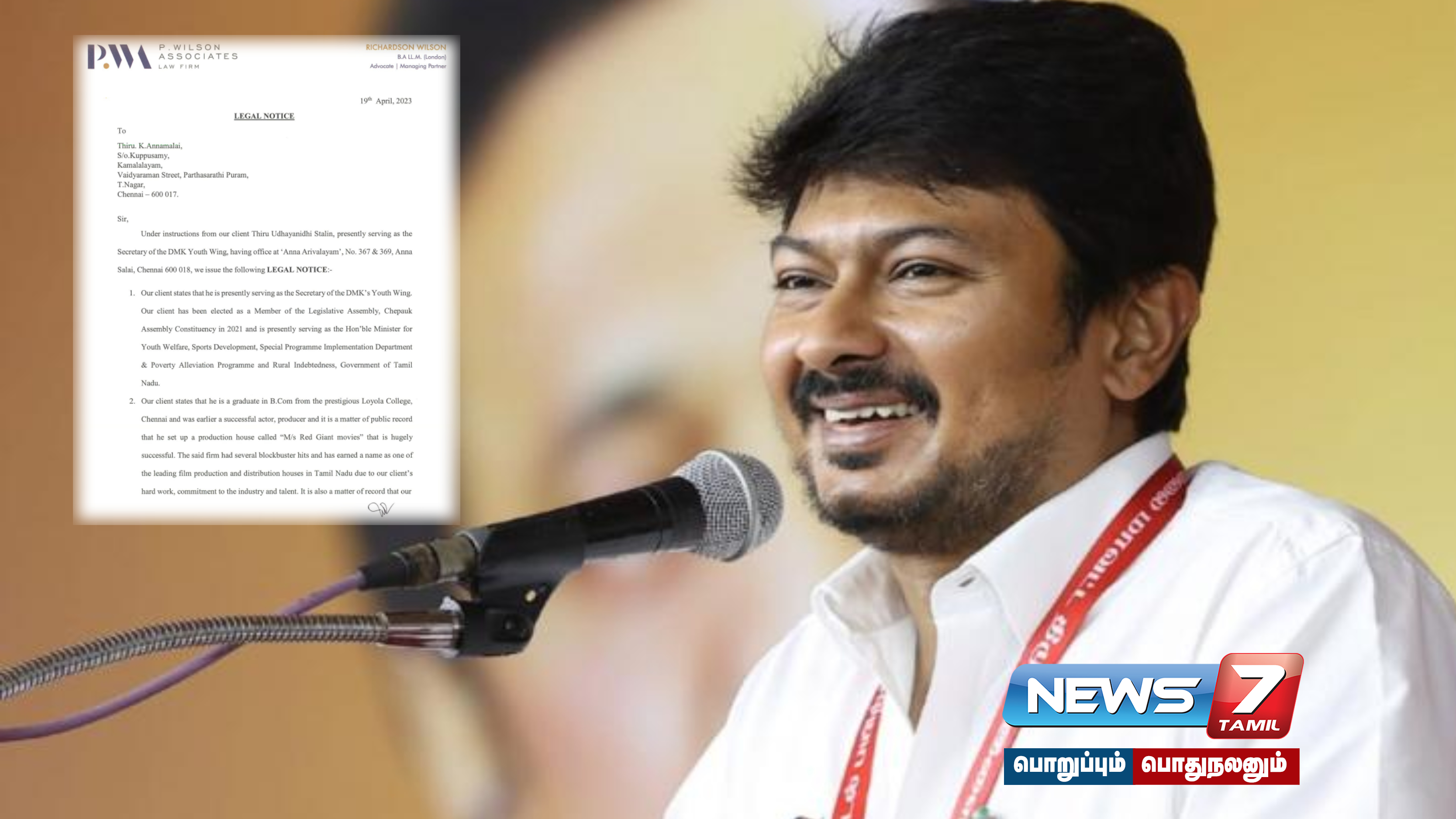 இந்த நிலையில் தமிழ்நாடு பாஜக தலைவர் அண்ணாமலைக்கு அமைச்சர் உதயநிதி சார்பில் மூத்த வழக்கறிஞர் பி.வில்சன் எம்.பி., நோட்டீஸ் அனுப்பியுள்ளார். அதில் அமைச்சர் உதயநிதி ஸ்டாலின் மீது அவதூறான, உண்மைக்குப் புறம்பான குற்றச்சாட்டுகளை முன்வைத்ததாக தெரிவிக்கப்பட்டுள்ளது. மேலும் செய்தித்தாள்கள் மற்றும் அனைத்து தேசிய, மாநில தொலைக்காட்சி சேனல்கள், சமூக ஊடக பக்கங்களிலும், செய்தியாளர் சந்திப்பின் அவதூறான வீடியோவை உடனடியாக அகற்ற வேண்டும் எனவும் அண்ணாமலை நிபந்தனையற்ற பகிரங்க மன்னிப்பு கேட்கவேண்டும் எனவும் தெரிவிக்கப்பட்டுள்ளது.