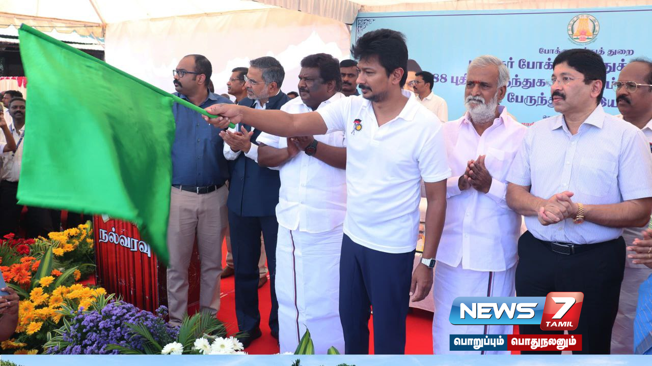 சென்னையில்100 தாழ்தள பேருந்துகளை அமைச்சர் உதயநிதி ஸ்டாலின் இன்று பொது மக்கள் பயன்பாட்டுக்காக தொடங்கி வைத்தார்.