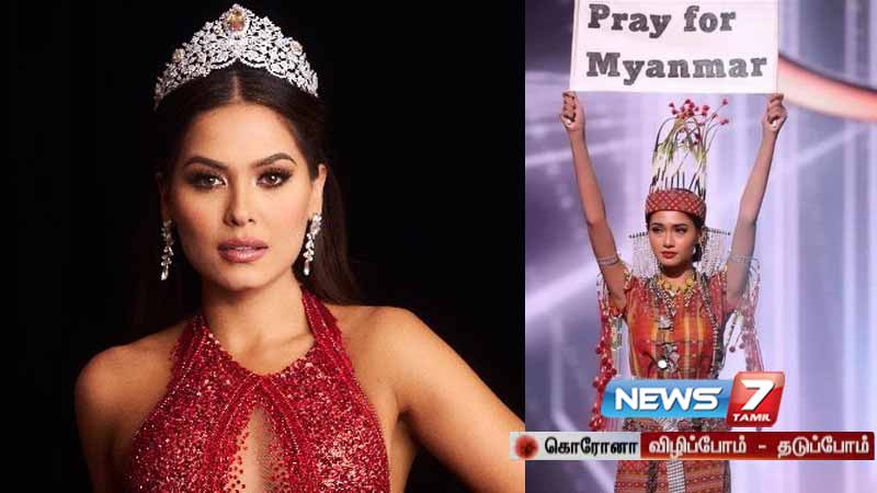 மியான்மரியில் தற்போது நடைபெற்றுவரும் ராணுவ ஆட்சியில் நூற்றுக்கணக்கான மக்கள் கொல்லப்பட்டுள்ளனர். ராணுவ ஆட்சியை விலக கோரி அந்நாட்டு மக்கள் தினமும் போராட்டத்தில் ஈடுப்பட்டுவருகிறார்கள். இந்நிலையில் உலக அழகி போட்டியில் கலந்துகொண்டு மியான்மர் அழகி துசர் விண்ட் லவின் இறுதிசுற்றுக்கு முந்தையை சுற்றான சிறந்த தேசிய ஆடை சுற்றில் இந்த பதாகையுடன் மேடையில் தோன்றினார்.