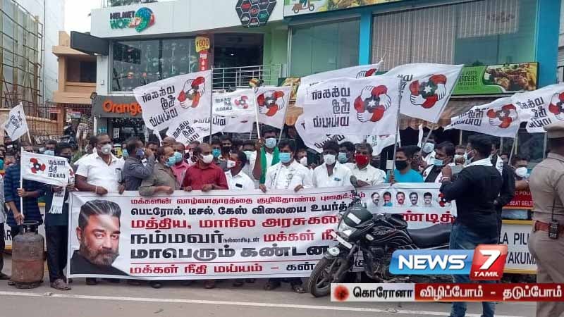 பெட்ரோல், டீசல் விலை உயர்வுக்கு எதிர்ப்பு தெரிவித்து தமிழ்நாடு முழுவதும் பல்வேறு இடங்களில் மக்கள் நீதி மய்யம் சார்பில் கண்டன ஆர்ப்பாட்டம் நடைபெற்றது.
