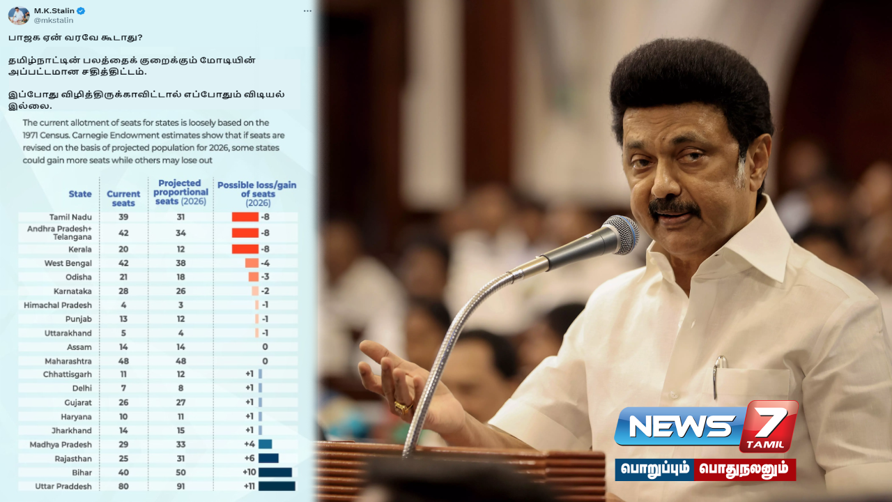 “பாஜக ஏன் வரவே கூடாது? தமிழ்நாட்டின் பலத்தைக் குறைக்கும் மோடியின் அப்பட்டமான சதித்திட்டம். இப்போது விழித்திருக்காவிட்டால் எப்போதும் விடியல் இல்லை. பாஜக மீண்டும் ஆட்சிக்கு வந்தால் தமிழ்நாட்டுக்கு ஏற்படப் போகிற பாரதூரமான பாதகம் – தொகுதி மறுசீரமைப்பு என்ற பெயரில் இந்தியாவின் நாடாளுமன்றத்தில் உறுப்பினர்களின் எண்ணிக்கையை உயர்த்துவது. தமிழ்நாடு உள்பட மக்கள் தொகையைச் சிறப்பாகக் கட்டுப்படுத்திய மாநிலங்களைத் தண்டிப்பதற்கு போடப்பட்டிருக்கிற அச்சாரம்.