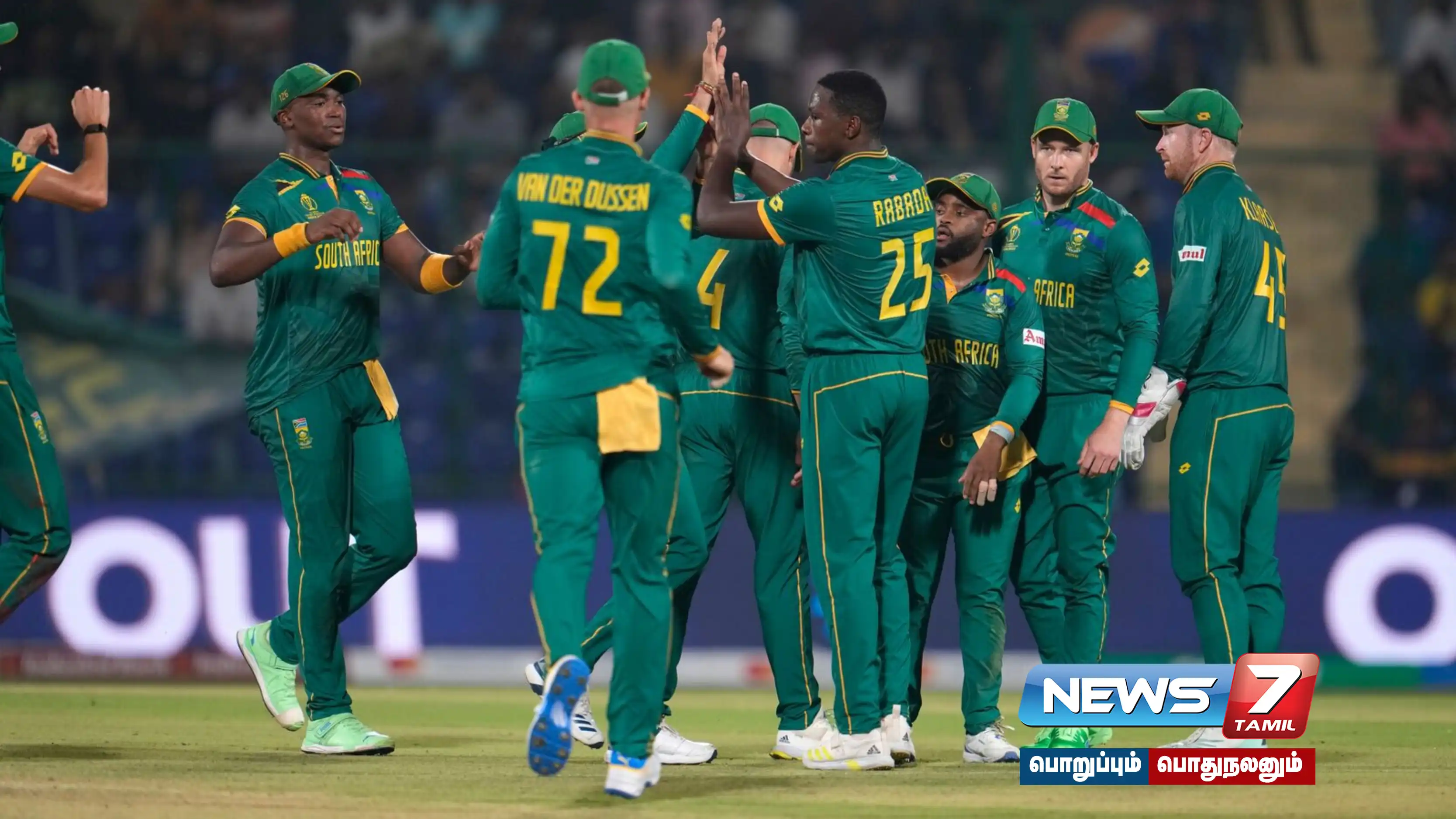 குயின்டன் டி காக், ஸ்ஸி வான் டெர் டுசென், ஐடன் மார்க்ராம், சதமடித்து அசத்தினர். இதன்மூலம் ஒரே போட்டியில் மூன்று சதமடித்த ஒரே அணி மற்றும் உலகக் கோப்பை வரலாற்றில் அதிகபட்ச ரன்கள் குவித்த அணி என வரலாற்று சாதனைகளை படைத்துள்ளது தென்னாப்பிரிக்கா.