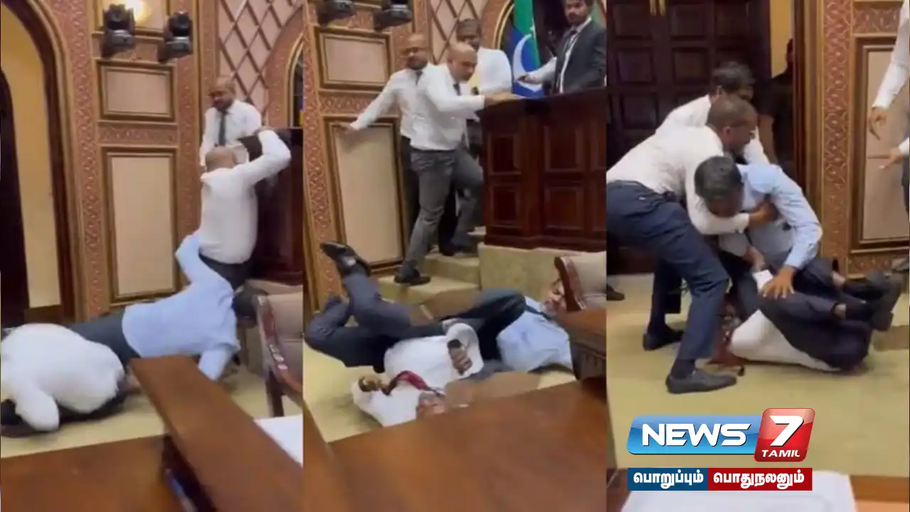 மோதலை தடுக்க வந்தவர்களையும் அவர்கள் தாக்குவது போன்று வீடியோவில் பதிவாகி உள்ளது. மேலும், மற்றொரு வீடியோவில், சபாநாயகர் அமர்ந்திருக்கும் இடத்திற்கு சென்று மைக்குகளை பிடுங்கி ஏறிந்திருக்கின்றனர். மேலும், இரண்டு பேர் சபாநாயகர் பக்கத்தில் நின்று விளையாட்டு பொருளை கையில் எடுத்து ஊதுகின்றனர். அந்த சத்தம் தாங்க முடியாமல் சபாநாயகரும் காதை மூடும் காட்சிகளும் பதிவாகி உள்ளன. மாலத்தீவு நாடாளுமன்றத்திற்குள் எம்பிக்கள் அடித்துக்கொண்ட காட்சிகள் வெளியாகி வைரலாகி வருகிறது.