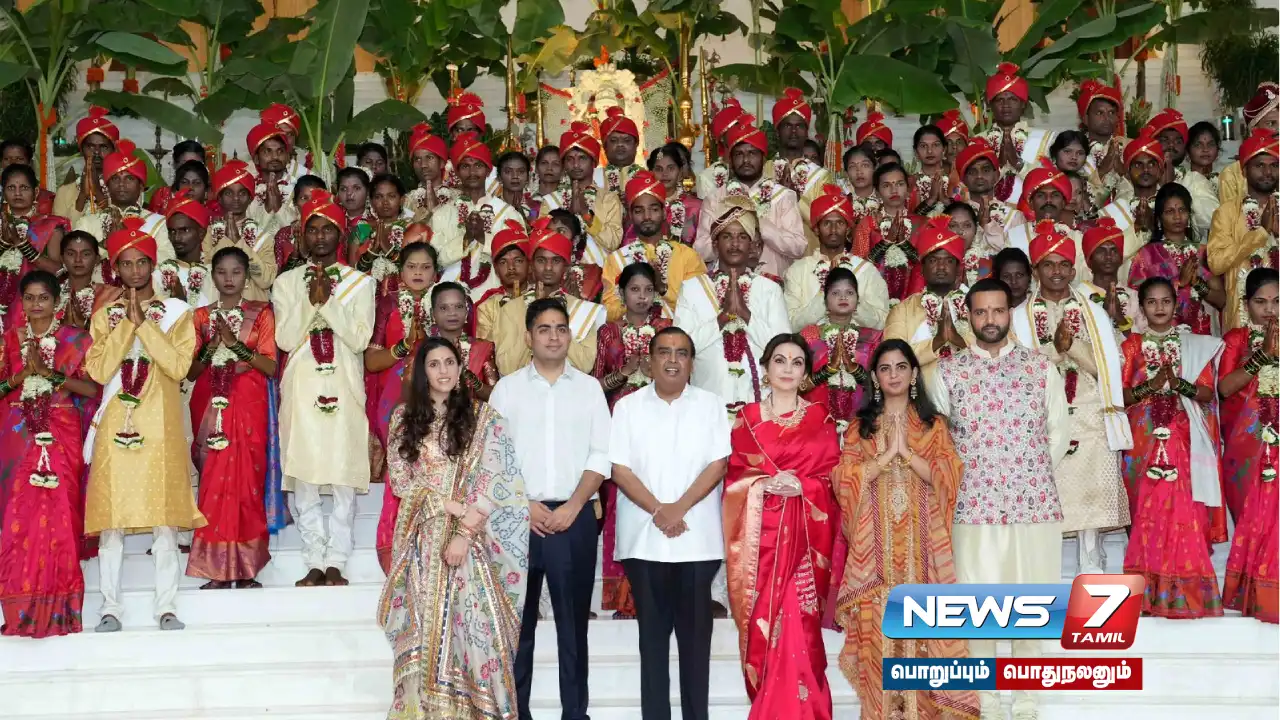 ஆனந்த் அம்பானி மற்றும் ராதிகா மெர்ச்சண்ட் இணையருக்கான திருமண கொண்டாட்டத்தின் ஆரம்பமாக மகாராஷ்டிரா பால்கர் பகுதியை சேர்ந்த 50 மணமக்களுக்கு அம்பானி குடும்பத்தினர் திருமணம் நடத்தி வைத்தனர்.