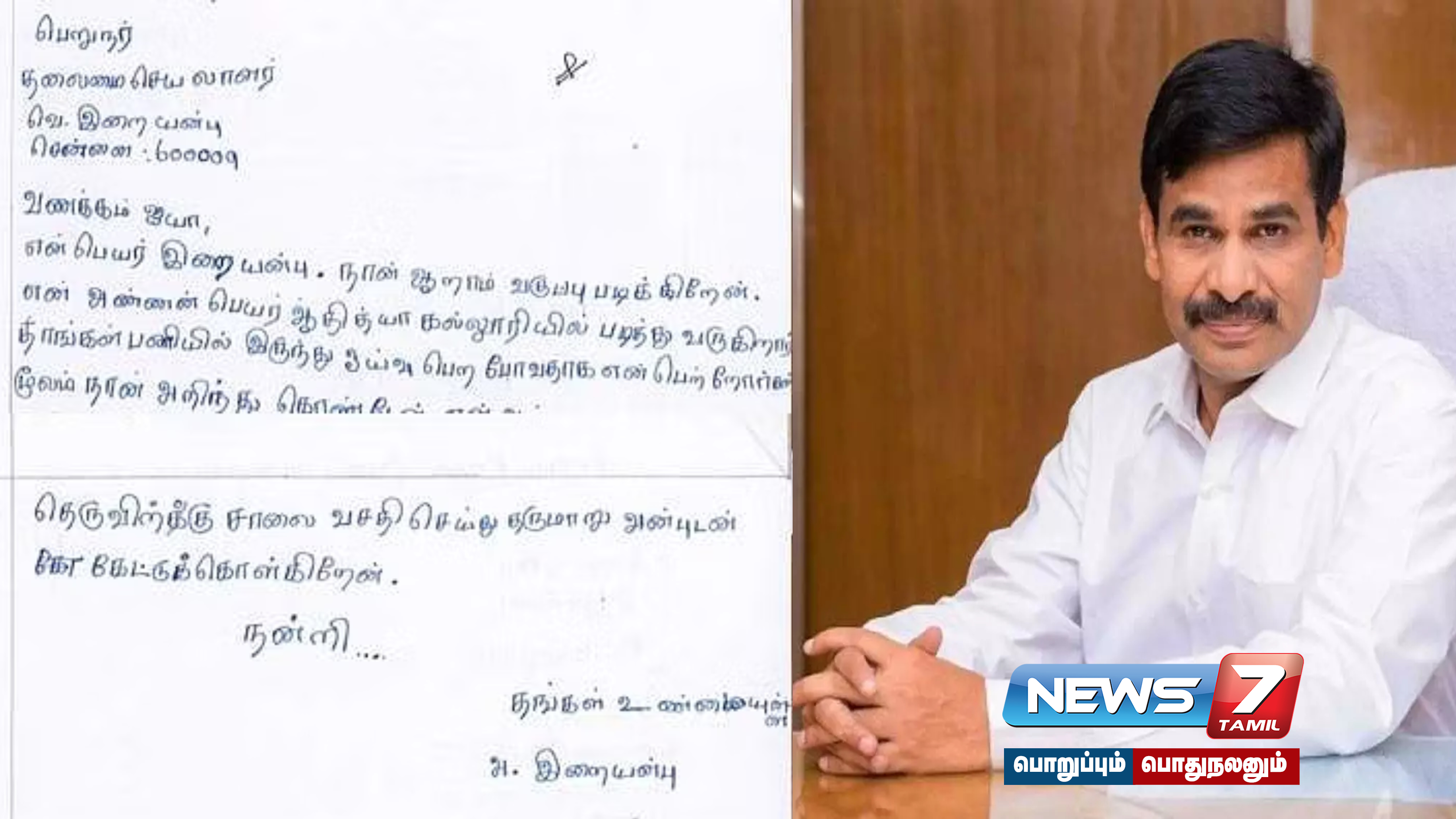ஐயாநானும் எனது நண்பர்களும் மாலை நேரங்களில் விளையாடுவோம். எங்கள்தெரு மழைக்காலங்களில் மிகவும் குண்டும் குழியாகவும் மாறி விடுகிறது. நடப்பதற்கு மிகவும் சிரமமாக உள்ளது. பலர் வழுக்கி விழவும் நேரிடுகிறது. தயவுகூர்ந்து எங்கள் தெருவிற்க்கு சாலை வசதி செய்து தருமாறு அன்புடன் கேட்டுக்கொள்கிறேன். இவ்வாறு அதில் எழுதி தலைமைச் செயலாளர் இறையன்புவிற்கு கோரிக்கை வைத்துள்ளார் .