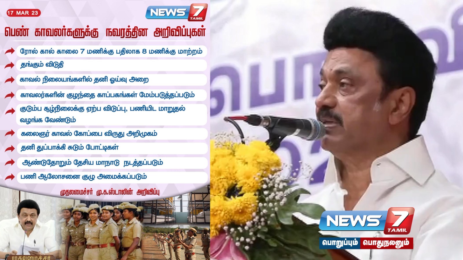 ரோல் கால் நேரம் மாற்றம், பெண் காவலர்களுக்கு தங்கும் விடுதி உள்ளிட்ட 9 திட்டங்களை முதலமைச்சர் மு.க.ஸ்டாலின் இன்று அறிவித்துள்ளார்.