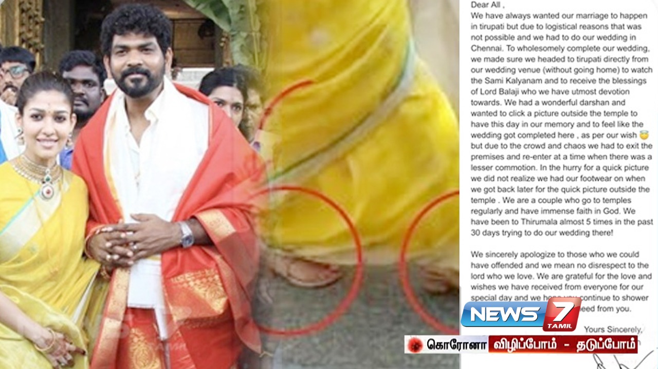 இச்சம்பவம் தொடர்பாக இயக்குநர் விக்னேஷ் சிவன் மன்னிப்புக் கோரி அறிக்கை வெளியிட்டுள்ளார். அதில், அன்புள்ள அனைவருக்கும், எங்களுடைய திருமணத்தை நாங்கள் திருப்பதியில் நடத்தவே திட்டமிட்டிருந்தோம். ஆனால், சில நிர்வாக காரணங்களால் எங்களுடைய திருமணத்தை திருப்பதியில் நடத்த முடியாததால் சென்னையில் நடத்தினோம். திருமணம் முடிந்த கையோடு மண்டபத்தில் இருந்து வீட்டிற்கு கூட செல்லாமல் நேரடியாக திருப்பதிக்கு சுவாமி கல்யாணம் பார்ப்பதற்காகவும், கடவுளின் ஆசிர்வாதம் பெறுவதற்காகவும் வந்தோம். அந்த அளவுக்கு எங்களுக்கு கடவுளின்மேல் மிகுந்த பக்தி உள்ளது.