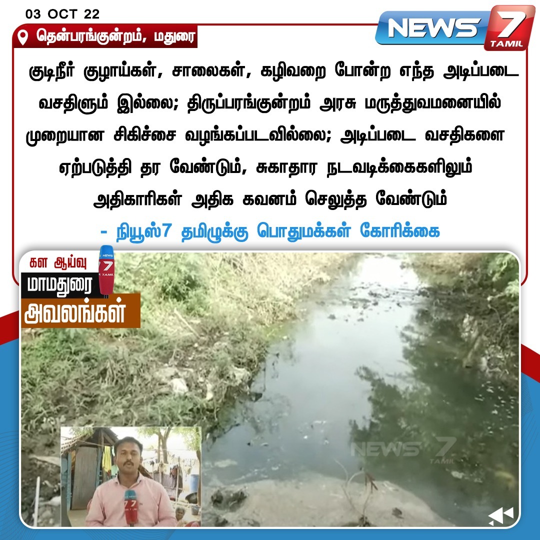 இதேபோல் கோசாக்குளம் பகுதி மக்கள் கூறுகையில், கிட்டத்தட்ட 2 ஆண்டுகளாக சேதமடைந்த சாலைகளை இதுவரை சீரமைக்கவில்லை. சுமார் 5 கி.மீ. வரை சாலை சேதமடைந்துள்ளதால் வாகன ஓட்டிகள் மிகுந்த சிரமத்திற்குள்ளாகி வருவதாக கூறினர். தென்பரங்குன்றத்தில் நடத்திய கள ஆய்வில், சாலைகள், கழிவறைகள் போன்ற எந்த அடிப்படை வசதிகளும் இல்லை என பொதுமக்கள் வேதனை தெரிவித்தனர். திருப்பரங்குன்றம்அரசு மருத்துவமனையில் முறையான சிகிச்சை வழங்கப்படவில்லை. அடிப்படை வசதிகளை ஏற்படுத்தி கொடுக்க வேண்டும். சுகாதார நடவடிக்கைகளிலும் அதிகாரிகள் அதிக கவனம் செலுத்த வேண்டும் என கோரிக்கை வைத்துள்ளனர்.
