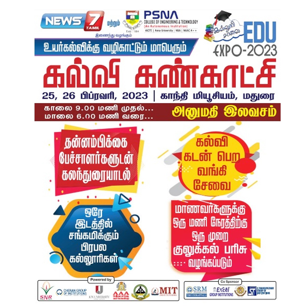 நியூஸ் 7 தமிழ் சார்பாக மதுரை மாநகரில் 25 மற்றும் 26ம் தேதிகளில் மாபெரும் கல்வி கண்காட்சி நடைபெற உள்ளது.