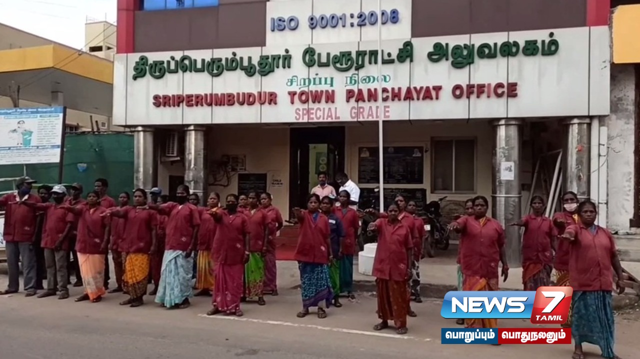ஸ்ரீபெரும்புதூர் பேரூராட்சியில் ஒப்பந்த அடிப்படையில் பணிபுரியும் தூய்மை பணியாளர்களுக்கு அரசு நிர்ணயித்த ஊதியம் வழங்கப்படவில்லை எனவும், பாதுகாப்பு உபகரணங்கள் இல்லாமல் பணியாற்றுவதாகவும் அவர்கள் வேதனை தெரிவித்துள்ளனர்.