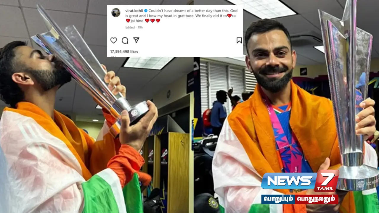உலகக் கோப்பையை வென்ற பிறகு விராட் கோலி தனது இன்ஸ்டாகிரம் பக்கத்தில் பதிவிட்டுள்ள பதிவில்.. “இதைவிட சிறந்த நாளைக் கனவில்கூட கண்டிருக்க முடியாது. கடவுள் மிகப் பெரியவர், நன்றியுடன் தலை வணங்குகிறேன். இறுதியாக நாங்கள் வெற்றி பெற்றுவிட்டோம். ஜெய்ஹிந்த்..!” எனக் குறிப்பிட்டிருந்தார். இந்தப் பதிவுக்கு 1 கோடியே 64 லட்சத்துக்கும் அதிமான லைக்குகள் பதிவாகியுள்ளன.