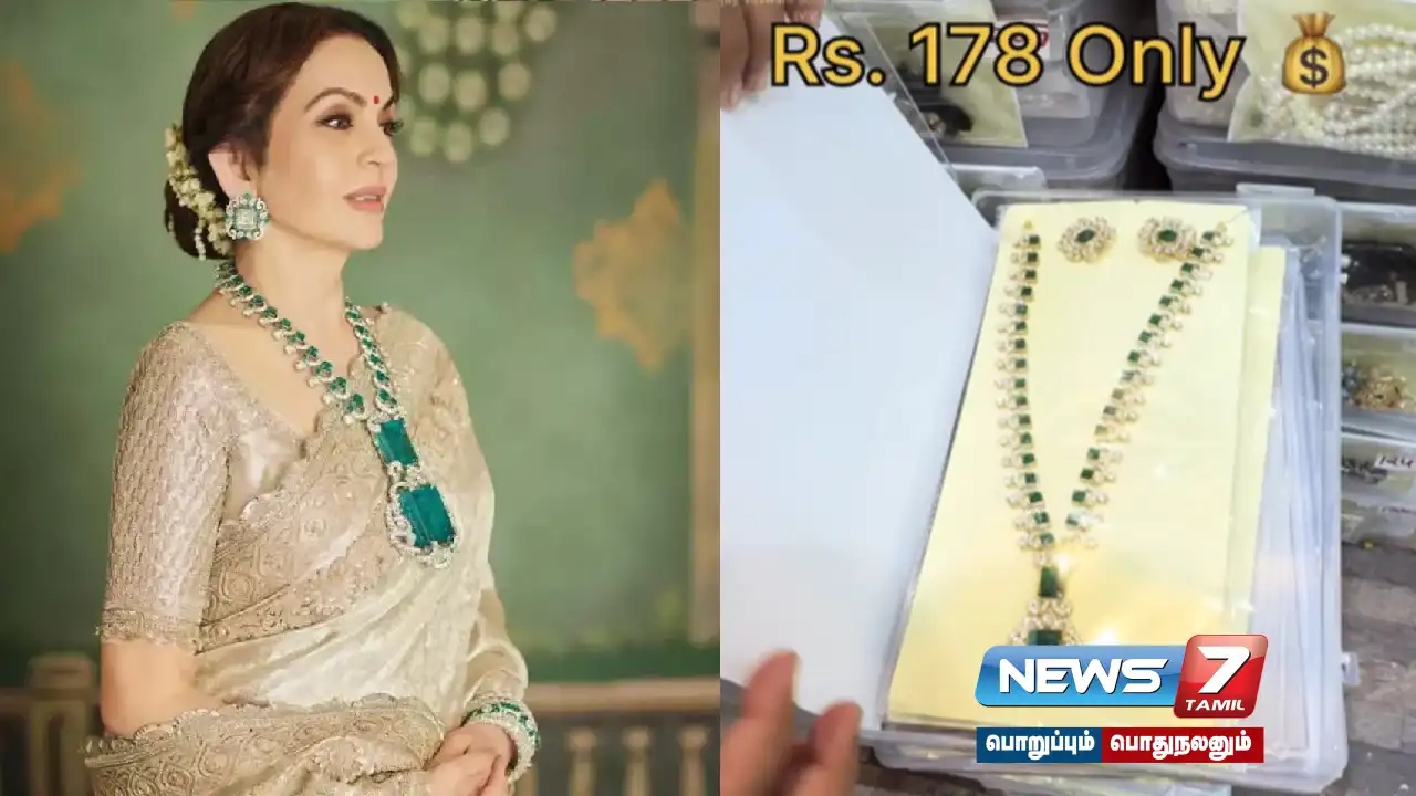 இந்த விழாவில் முகேஷ் அம்பானியின் மனைவியான நீடா அம்பானி அனைவரது கவனத்தையும் ஈர்த்தார். காரணம் கையால் நெய்யப்பட்ட காஞ்சிபுர பட்டுப்புடவையும், மரகத கற்களால் ஆன ரூ.500 கோடி மதிப்பிலான நெக்லஸும் அணிந்திருந்தார். இந்த ரூ.500 கோடி மதிப்பிலான நெக்லஸ் அப்போது பெரும் பேசுபொருளானது. இந்நிலையில் நீடா அம்பானி அணிந்திருந்த நெக்லஸ் வெறும் 178 ரூபாய்க்கு கிடைக்கும் என விற்பனையாளர் ஒருவர் இன்ஸ்டாகிராமில் பதிவிட்ட வீடியோ வைரலாகி வருகிறது.