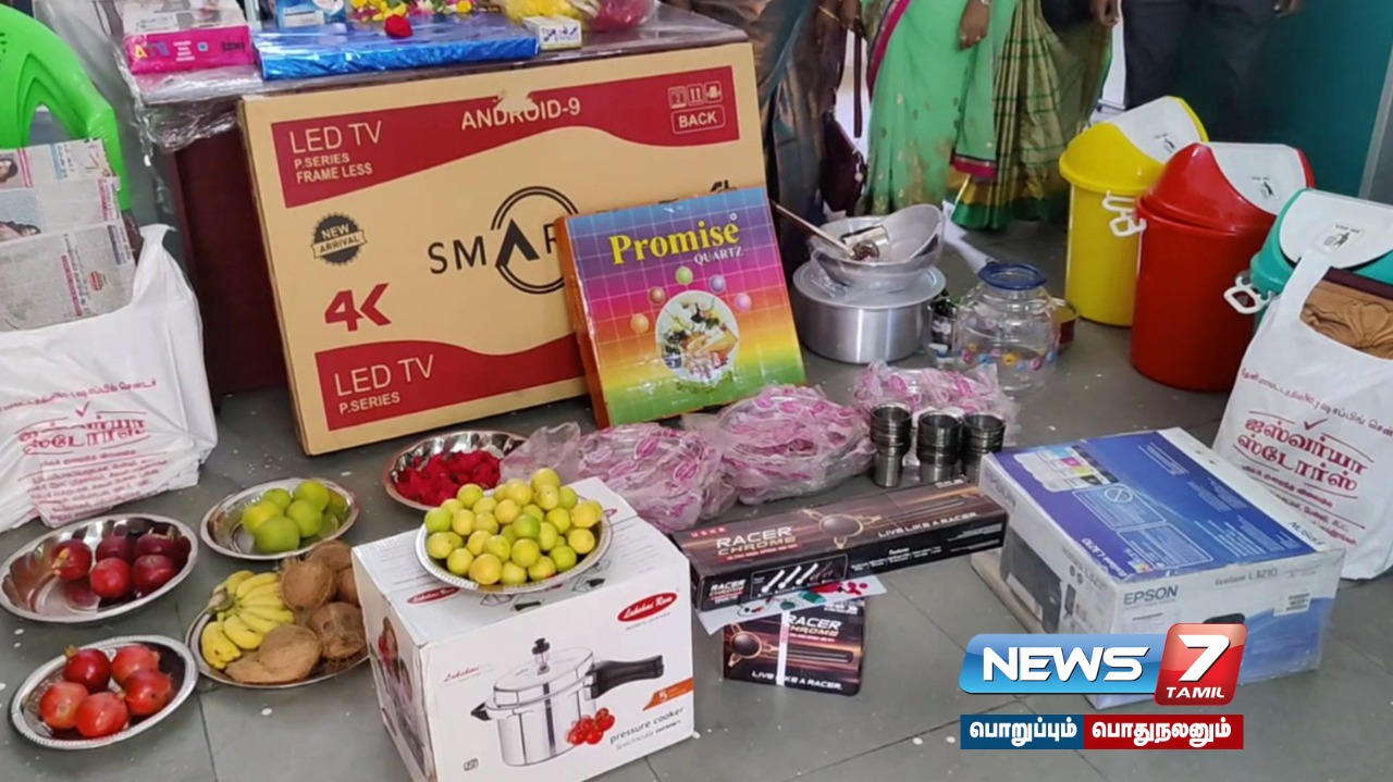 கல்வி உபகரணங்களான தொலைகாட்சி, பீரோ, மின்விசிறி, டேபிள், நாற்காலி, பிரிண்டர், பைகள், தட்டு, டம்ளர்கள், எழுதுபொருட்கள், நோட்டுகள், தண்ணீர் குடம், குக்கர், குப்பை தொட்டி