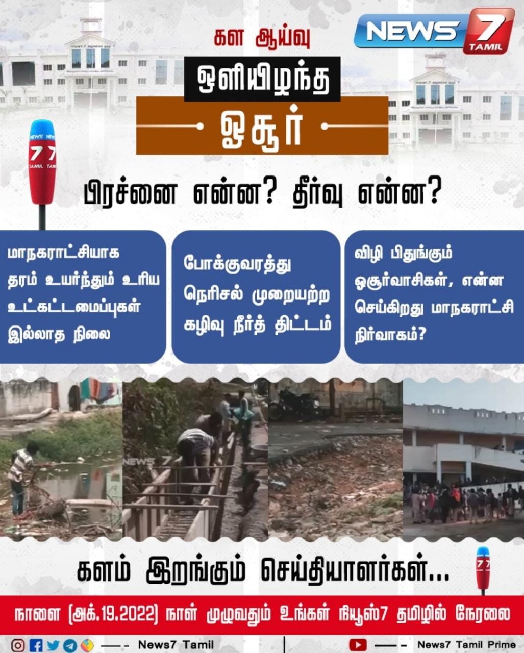 சமூக பொறுப்போடும் செயல்பட்டு வரும் நியூஸ் 7 தமிழ் அவ்வப்போது எடுக்கும் முன்னெடுப்புகள் மக்கள் மத்தியிலும், தமிழ்நாடு அரசு சார்பிலும் நல்ல வரவேற்பை பெற்றுள்ளதோடு, அதற்கான தீர்வுகளையும் பெற்று வருகிறது. அந்த வகையில், இன்று நாள் முழுவதும் ஓசூர் மாநகராட்சியில் கள ஆய்வு மேற்கொள்ளப்படவுள்ளது.